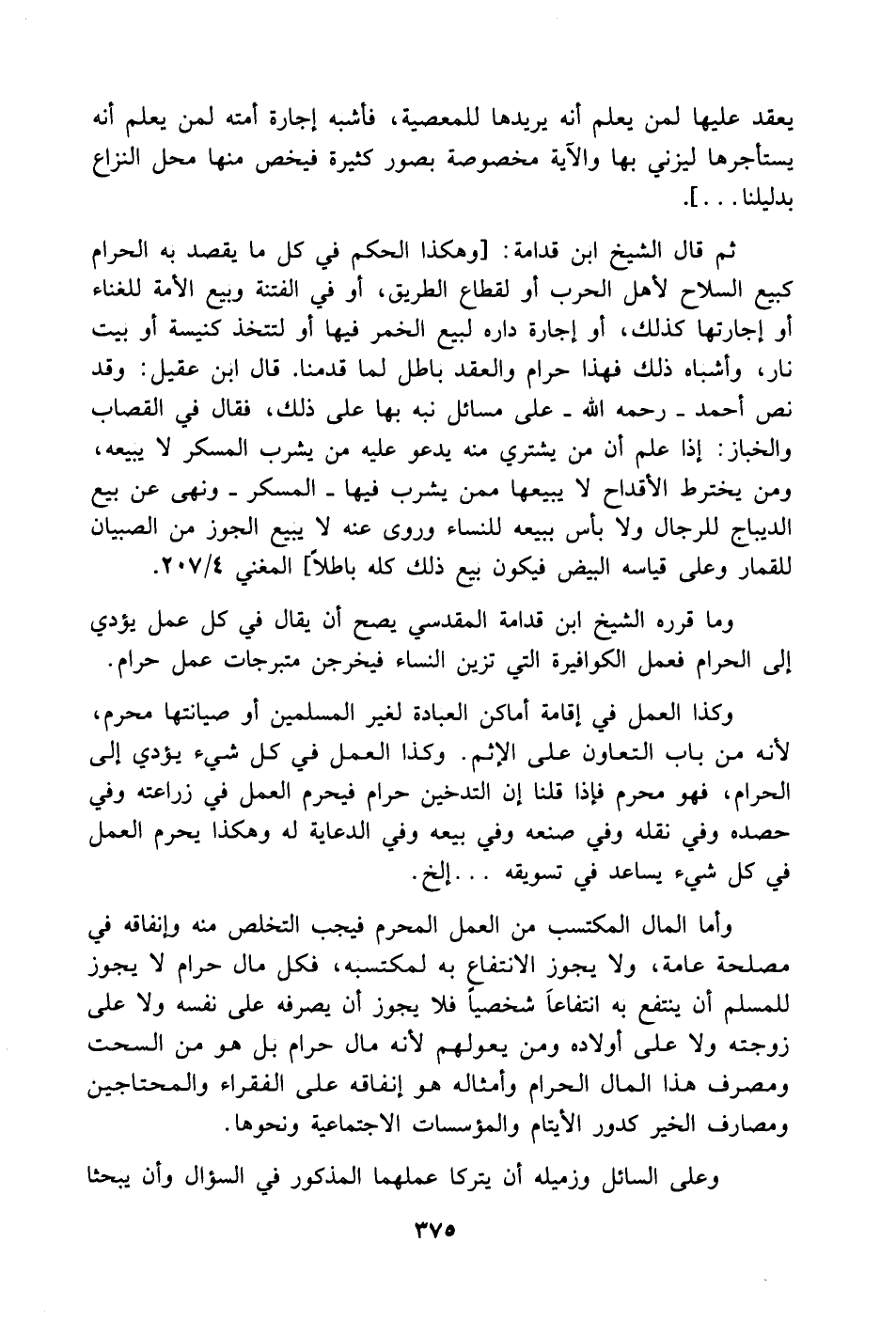 ثم قال الشيخ ابن قدامة: [وهكذا الحكم في كل ما يقصد به الحرام كبيع السلاح لأهل الحرب أو لقطاع الطريق، أو في الفتنة وبيع الأمة للغناء أو إجارتها كذلك, أو إجارة داره لبيع الخمر فيها أو لتتخذ كنيسة أو بيت نار, وأشباه ذلك فهذا حرام والعقد باطل لما قدمنا. قال ابن عقيل: وقد نص أحمد -رحمه الله- على مسائل نبه بها على ذلك, فقال في القصاب والخباز: إذا علم أن من يشتري منه يدعو عليه من يشرب المسكر لا يبيعه, ومن يخترط الأقداح لا يبيعها ممن يشرب فيها - المسكر - ونهى عن بيع الديباج للرجال ولا بأس ببيعه للنساء وروى عنه لا يبيع الجوز من الصبيان للقمار وعلى قياسه البيض فيكون بيع ذلك كله باطلاً] المغني 4/ 207.