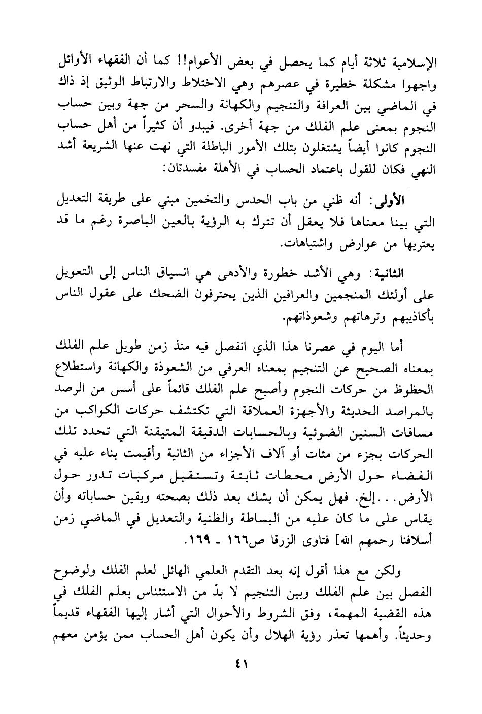 الإسلامية ثلاثة أيام كما يحصل في بعض الأعوام!! كما أن الفقهاء الأوائل واجهوا مشكلة خطيرة في عصرهم وهي الاختلاط والارتباط الوثيق إذ ذاك في الماضي بين العرافة والتنجيم والكهانة والسحر من جهة وبين حساب النجوم بمعنى علم الفلك من جهة أخرى. فيبدو أن كثيراً من أهل حساب النجوم كانوا أيضاً يشتغلون بتلك الأمور الباطلة التي نهت عنها الشريعة أشد النهي فكان للقول باعتماد الحساب في الأهلة مفسدتان: