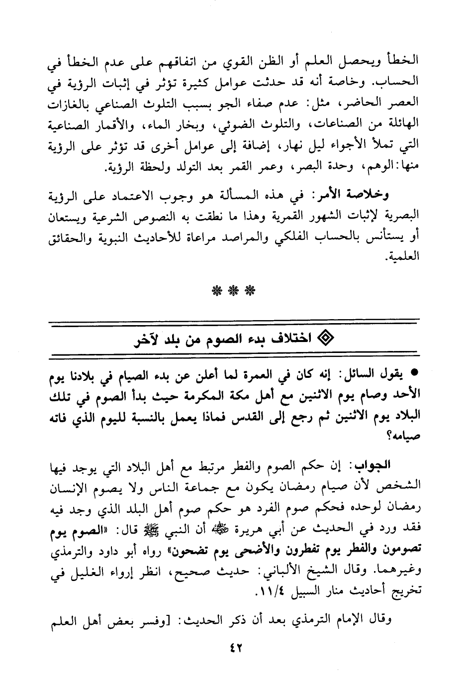الخطأ ويحصل العلم أو الظن القوي من اتفاقهم على عدم الخطأ في الحساب. وخاصة أنه قد حدثت عوامل كثيرة تؤثر في إثبات الرؤية في العصر الحاضر، مثل: عدم صفاء الجو بسبب التلوث الصناعي بالغازات الهائلة من الصناعات، والتلوث الضوئي، وبخار الماء، والأقمار الصناعية التي تملأ الأجواء ليل نهار، إضافة إلى عوامل أخرى قد تؤثر على الرؤية منها: الوهم، وحدة البصر، وعمر القمر بعد التولد ولحظة الرؤية.