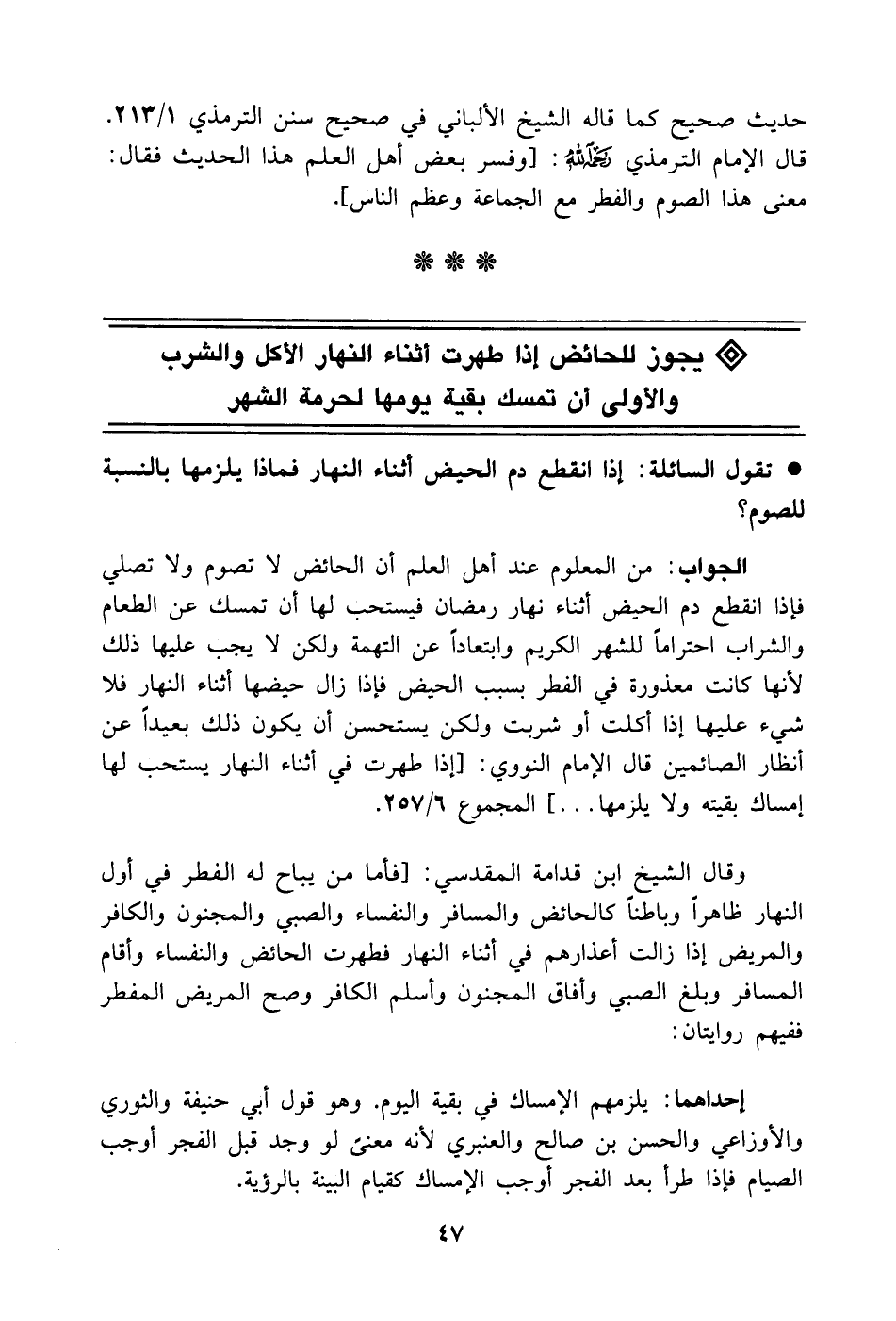 وقال الشيخ ابن قدامة المقدسي: [فأما من يباح له الفطر في أول النهار ظاهراً وباطناً كالحائض والمسافر والنفساء والصبي والمجنون والكافر والمريض إذا زالت أعذارهم في أثناء النهار فطهرت الحائض والنفساء وأقام المسافر وبلغ الصبي وأفاق المجنون وأسلم الكافر وصح المريض المفطر ففيهم روايتان: