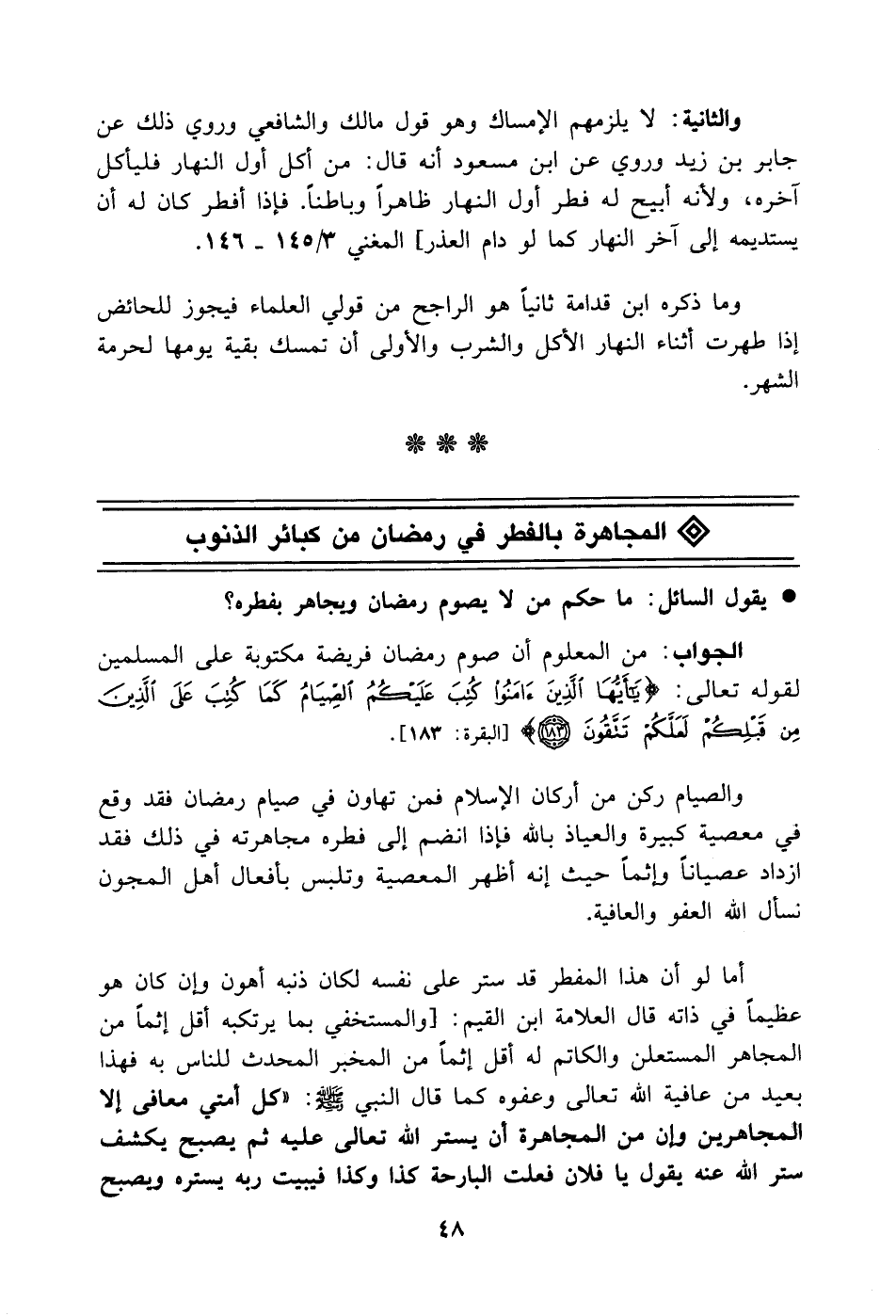 والثانية: لا يلزمهم الإمساك وهو قول مالك والشافعي وروي ذلك عن جابر بن زيد وروي عن ابن مسعود أنه قال: من أكل أول النهار فليأكل آخره، ولأنه أبيح له فطر أول النهار ظاهراً وباطناً. فإذا أفطر كان له أن يستديمه إلى آخر النهار كما لو دام العذر] المغني 3/ 145 - 146.