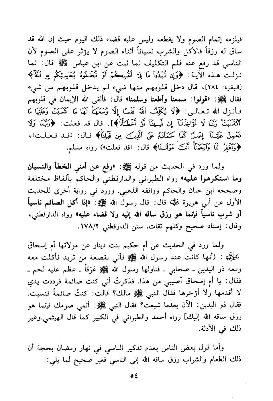 ولما ورد في الحديث من قوله - صَلَّى اللهُ عَلَيْهِ وَسَلَّمَ -: (رفع عن أمتي الخطأ والنسيان وما استكرهوا عليه) رواه الطبراني والدارقطني والحاكم بألفاظ مختلفة وصححه ابن حبان والحاكم ووافقه الذهبي. وورد في رواية أخرى للحديث الأول عن أبي هريرة - رضي الله عنه - قال: قال رسول الله- صَلَّى اللهُ عَلَيْهِ وَسَلَّمَ -: (إذا أكل الصائم ناسياً أو شرب ناسياً فإنما هو رزق ساقه الله إليه ولا قضاء عليه) رواه الدارقطني، وقال: إسناد صحيح وكلهم ثقات. سنن الدارقطني 2/ 178.