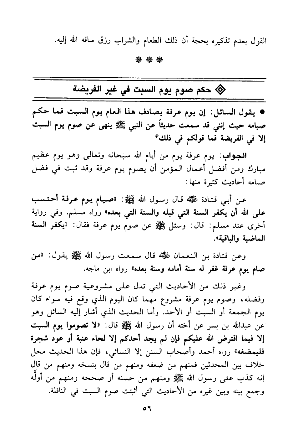 وغير ذلك من الأحاديث التي تدل على مشروعية صوم يوم عرفة وفضله، وصوم يوم عرفة مشروع مهما كان اليوم الذي وقع فيه سواء كان يوم الجمعة أو السبت أو الأحد. وأما الحديث الذي أشار إليه السائل وهو عن عبد الله بن بسر عن أخته أن رسول الله - صَلَّى اللهُ عَلَيْهِ وَسَلَّمَ - قال: (لا تصوموا يوم السبت إلا فيما افترض الله عليكم فإن لم يجد أحدكم إلا لحاء عنبة أو عود شجرة فليمضغه) رواه أحمد وأصحاب السنن إلا النسائي، فإن هذا الحديث محل خلاف بين المحدثين فمنهم من ضعفه ومنهم من قال بنسخه ومنهم من قال إنه كذب على رسول الله - صَلَّى اللهُ عَلَيْهِ وَسَلَّمَ - ومنهم من حسنه أو صححه ومنهم من أولَّه وجمع بينه وبين غيره من الأحاديث التي أثبتت صوم السبت في النافلة.