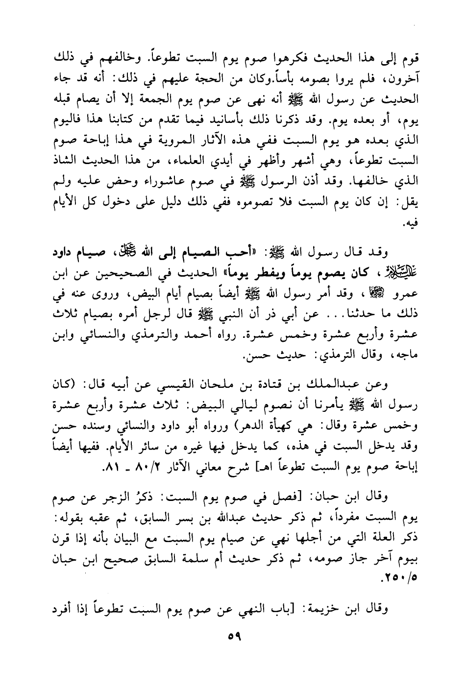 وقال ابن حبان: [فصل في صوم يوم السبت: ذكرُ الزجر عن صوم يوم السبت مفرداً، ثم ذكر حديث عبد الله بن بسر السابق، ثم عقبه بقوله: ذكر العلة التي من أجلها نهي عن صيام يوم السبت مع البيان بأنه إذا قرن بيوم آخر جاز صومه، ثم ذكر حديث أم سلمة السابق صحيح ابن حبان 5/ 250.