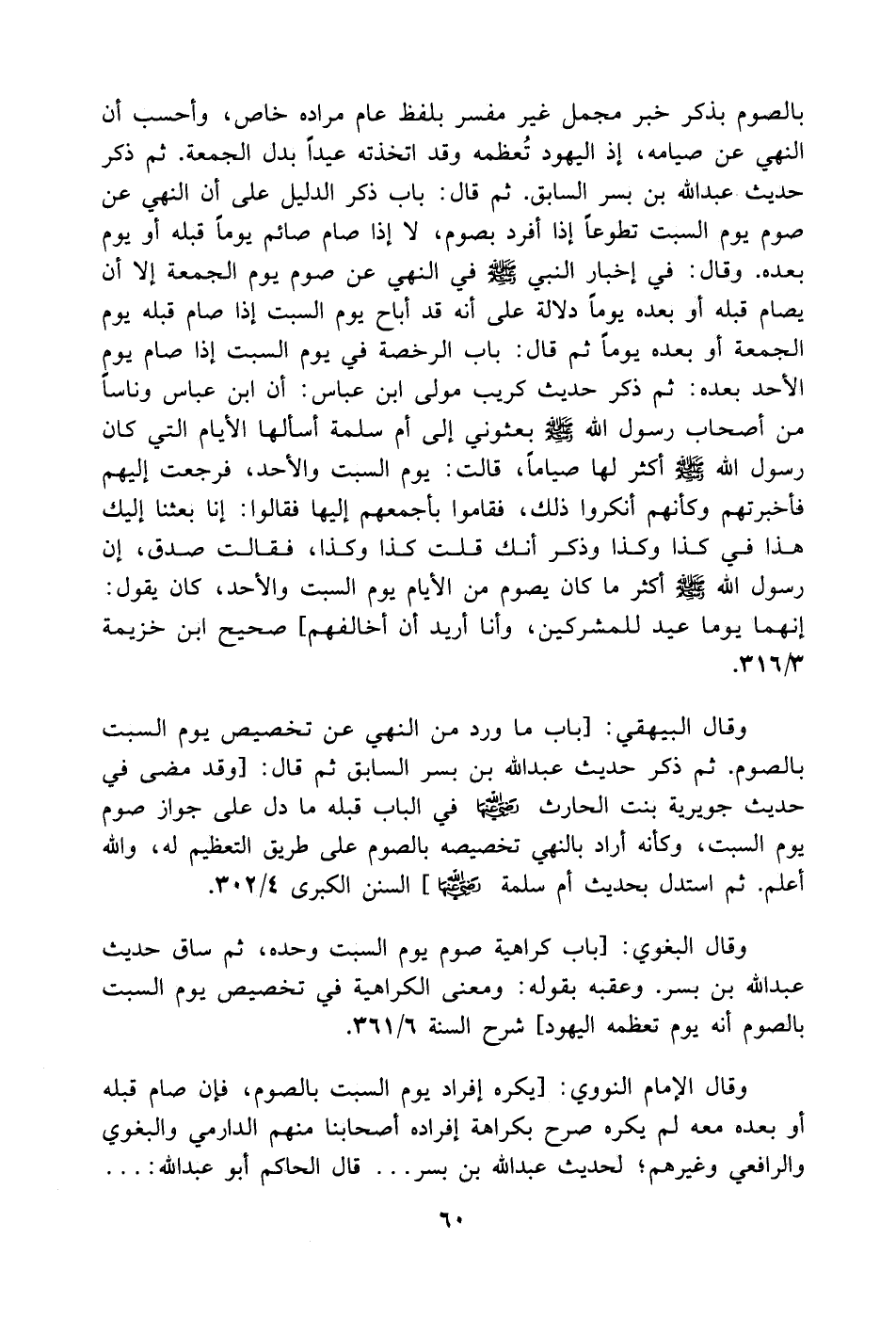 وقال البيهقي (باب ما ورد من النهي عن تخصيص يوم السبت بالصوم. ثم ذكر حديث عبد الله بن بسر السابق ثم قال: [وقد مضى في حديث جويرية بنت الحارث رضي الله عنها في الباب قبله ما دل على جواز صوم يوم السبت، وكأنه أراد بالنهي تخصيصه بالصوم على طريق التعظيم له، والله أعلم. ثم استدل بحديث أم سلمة رضي الله عنها] السنن الكبرى 4/ 302.