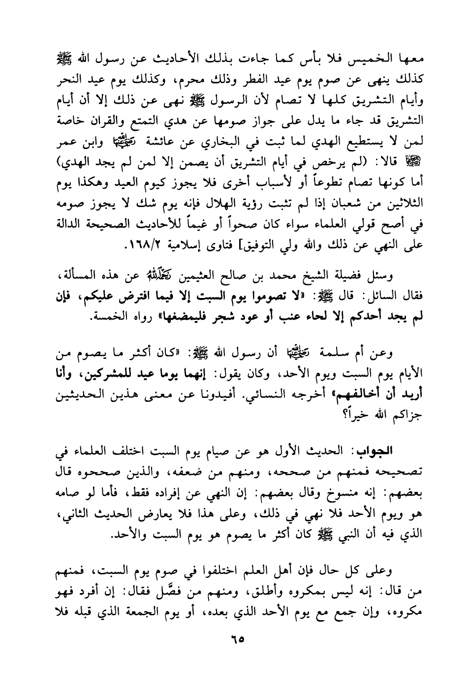 وسئل فضيلة الشيخ محمد بن صالح العثيمين رحمه الله عن هذه المسألة، فقال السائل: قال - صَلَّى اللهُ عَلَيْهِ وَسَلَّمَ -: (لا تصوموا يوم السبت إلا فيما افترض عليكم، فإن لم يجد أحدكم إلا لحاء عنب أو عود شجر فليمضغها) رواه الخمسة.