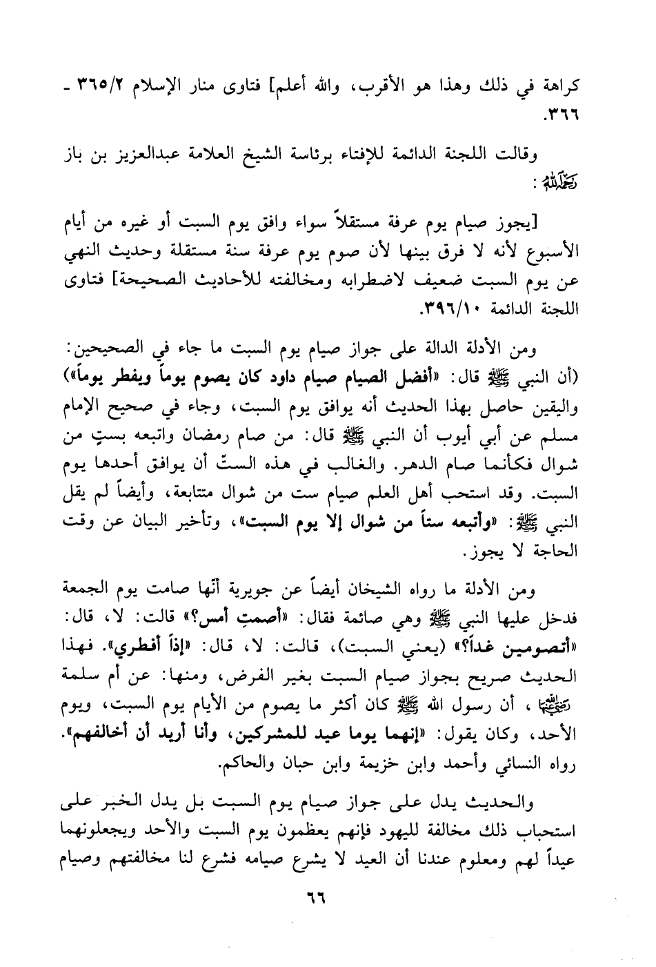ومن الأدلة الدالة على جواز صيام يوم السبت ما جاء في الصحيحين: (أن النبي - صَلَّى اللهُ عَلَيْهِ وَسَلَّمَ - قال: أفضل الصيام صيام داود كان يصوم يوماً ويفطر يوماً) واليقين حاصل بهذا الحديث أنه يوافق يوم السبت، وجاء في صحيح الإمام مسلم عن أبي أيوب أن النبي - صَلَّى اللهُ عَلَيْهِ وَسَلَّمَ - قال: من صام رمضان واتبعه بستٍ من شوال فكأنما صام الدهر. والغالب في هذه الستّ أن يوافق أحدها يوم السبت. وقد استحب أهل العلم صيام ست من شوال متتابعة، وأيضاً لم يقل النبي- صَلَّى اللهُ عَلَيْهِ وَسَلَّمَ -: (وأتبعه ستاً من شوال إلا يوم السبت)، وتأخير البيان عن وقت الحاجة لا يجوز.