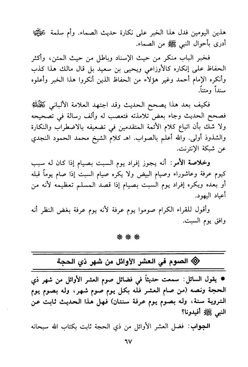 وخلاصة الأمر أنه يجوز إفراد يوم السبت بصيام إذا كان له سبب كيوم عرفة وعاشوراء وصيام البيض ولا يكره صيام السبت إذا صام يوماً قبله أو بعده ويكره إفراد يوم السبت بصيام إذا قصد المسلم تعظيمه لأنه من أعياد اليهود.