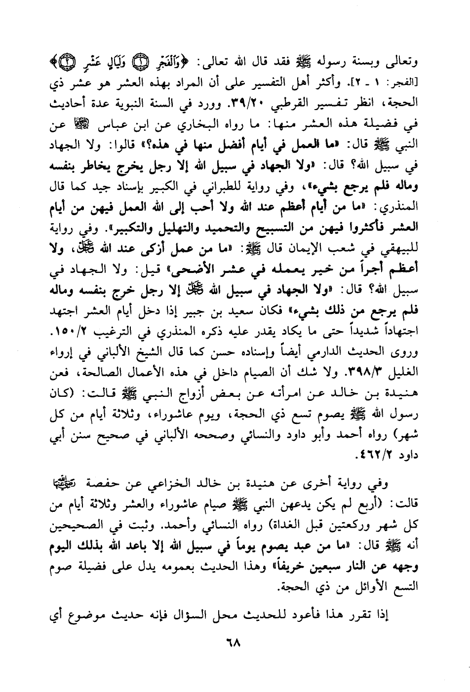 وتعالى وبسنة رسوله - صَلَّى اللهُ عَلَيْهِ وَسَلَّمَ - فقد قال الله تعالى: {وَالْفَجْرِ وَلَيَالٍ عَشْرٍ} سورة الفجر الآيتان 1 - 2. وأكثر أهل التفسير على أن المراد بهذه العشر هو عشر ذي الحجة، انظر تفسير القرطبي 20/ 39. وورد في السنة النبوية عدة أحاديث في فضيلة هذه العشر منها: ما رواه البخاري عن ابن عباس رضي الله عنهما عن النبي - صَلَّى اللهُ عَلَيْهِ وَسَلَّمَ - قال: (ما العمل في أيام أفضل منها في هذه؟ قالوا: ولا الجهاد في سبيل الله؟ قال: ولا الجهاد في سبيل الله إلا رجل يخرج يخاطر بنفسه وماله فلم يرجع بشيء) وفي رواية للطبراني في الكبير بإسناد جيد كما قال المنذري: (ما من أيام أعظم عند الله ولا أحب إلى الله العمل فيهن من أيام العشر فأكثروا فيهن من التسبيح والتحميد والتهليل والتكبير). وفي رواية للبيهقي في شعب الإيمان قال - صَلَّى اللهُ عَلَيْهِ وَسَلَّمَ -: (ما من عمل أزكى عند الله عز وجل، ولا أعظم أجراً من خير يعمله في عشر الأضحى) قيل: ولا الجهاد في سبيل الله؟ قال: (ولا الجهاد في سبيل الله عز وجل إلا رجل خرج بنفسه وماله فلم يرجع من ذلك بشيء) فكان سعيد بن جبير إذا دخل أيام العشر اجتهد اجتهاداً شديداً حتى ما يكاد يقدر عليه ذكره المنذري في الترغيب 2/ 150. وروى الحديث الدارمي أيضاً وإسناده حسن كما قال الشيخ الألباني في إرواء الغليل 3/ 398. ولا شك أن الصيام داخل في هذه الأعمال الصالحة، فعن هنيدة بن خالد عن امرأته عن بعض أزواج النبي - صَلَّى اللهُ عَلَيْهِ وَسَلَّمَ - قالت: (كان رسول الله - صَلَّى اللهُ عَلَيْهِ وَسَلَّمَ - يصوم