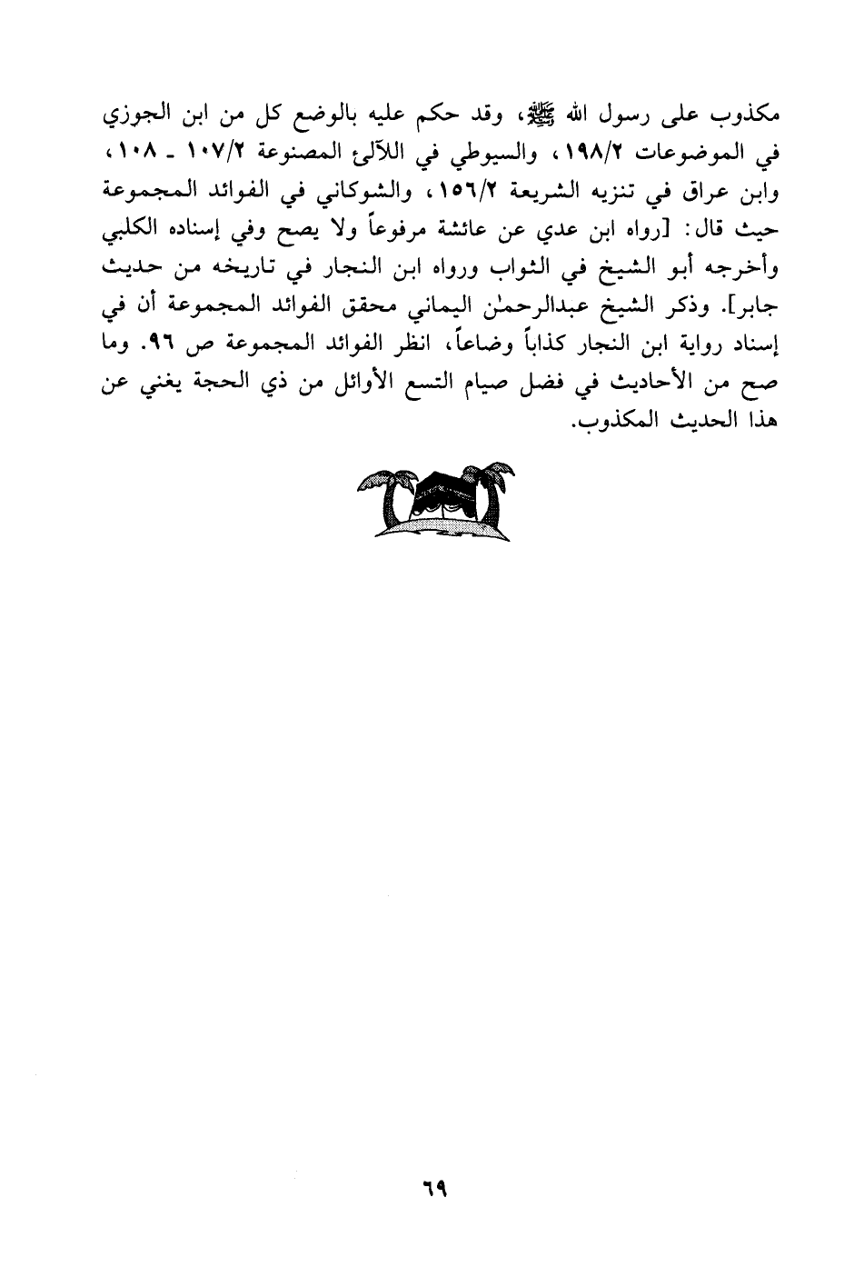 مكذوب على رسول الله - صَلَّى اللهُ عَلَيْهِ وَسَلَّمَ -، وقد حكم عليه بالوضع كل من ابن الجوزي في الموضوعات 2/ 198، والسيوطي في اللآلئ المصنوعة 2/ 107 - 108، وابن عراق في تنزيه الشريعة 2/ 156، والشوكاني في الفوائد المجموعة حيث قال: [رواه ابن عدي عن عائشة مرفوعاً ولا يصح وفي إسناده الكلبي وأخرجه أبو الشيخ في الثواب ورواه ابن النجار في تاريخه من حديث جابر]. وذكر الشيخ عبد الرحمن اليماني محقق الفوائد المجموعة أن في إسناد رواية ابن النجار كذاباً وضاعاً، انظر الفوائد المجموعة ص 96. وما صح من الأحاديث في فضل صيام التسع الأوائل من ذي الحجة يغني عن هذا الحديث المكذوب.