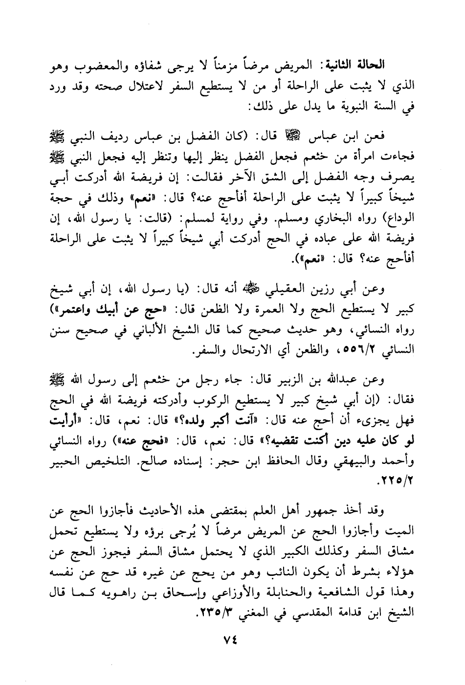 الحالة الثانية: المريض مرضاً مزمناً لا يرجى شفاؤه والمعضوب وهو الذي لا يثبت على الراحلة أو من لا يستطيع السفر لاعتلال صحته وقد ورد في السنة النبوية ما يدل على ذلك: