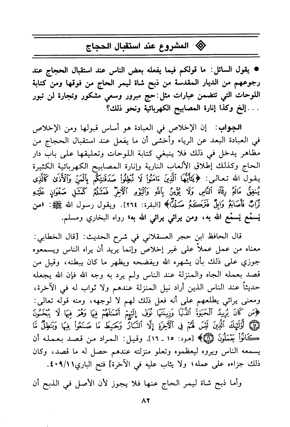 الجواب: إن الإخلاص في العبادة هو أساس قبولها ومن الإخلاص في العبادة البعد عن الرياء وأخشى أن ما يفعل عند استقبال الحجاج من مظاهر يدخل في ذلك فلا ينبغي كتابة اللوحات وتعليقها على باب دار الحاج وكذلك إطلاق الألعاب النارية وإنارة المصابيح الكهربائية الكثيرة يقول الله تعالى: {يَا أَيُّهَا الَّذِينَءَامَنُوا لَا تُبْطِلُوا صَدَقَاتِكُمْ بِالْمَنِّ وَالْأَذَى كَالَّذِي يُنْفِقُ مَالَهُ رِئَاءَ النَّاسِ وَلَا يُؤْمِنُ بِاللَّهِ وَالْيَوْمِ الْآخِرِ فَمَثَلُهُ كَمَثَلِ صَفْوَانٍ عَلَيْهِ تُرَابٌ فَأَصَابَهُ وَابِلٌ فَتَرَكَهُ صَلْدًا} سورة البقرة الآية 264. ويقول رسول الله - صَلَّى اللهُ عَلَيْهِ وَسَلَّمَ -: (من يُسمِّع يُسمِّع الله به، ومن يرائي يرائي الله به) رواه البخاري ومسلم.