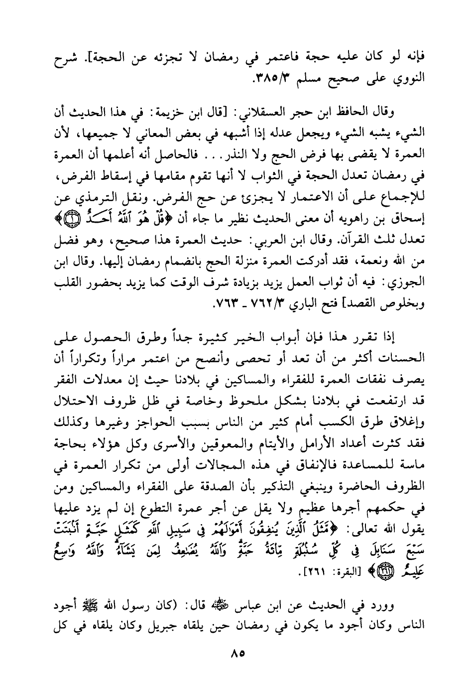 وقال الحافظ ابن حجر العسقلاني: [قال ابن خزيمة: في هذا الحديث أن الشيء يشبه الشيء ويجعل عدله إذا أشبهه في بعض المعاني لا جميعها, لأن العمرة لا يقضى بها فرض الحج ولا النذر. فالحاصل أنه أعلمها أن العمرة في رمضان تعدل الحجة في الثواب لا أنها تقوم مقامها في إسقاط الفرض, للإجماع على أن الاعتمار لا يجزئ عن حج الفرض. ونقل الترمذي عن إسحاق بن راهويه أن معنى الحديث نظير ما جاء أن {قُلْ هُوَ اللَّهُ أَحَدٌ} تعدل ثلث القرآن. وقال ابن العربي: حديث العمرة هذا صحيح, وهو فضل من الله ونعمة, فقد أدركت العمرة منزلة الحج بانضمام رمضان إليها. وقال ابن الجوزي: فيه أن ثواب العمل يزيد بزيادة شرف الوقت كما يزيد بحضور القلب وبخلوص القصد] فتح الباري 3/ 762 - 763.