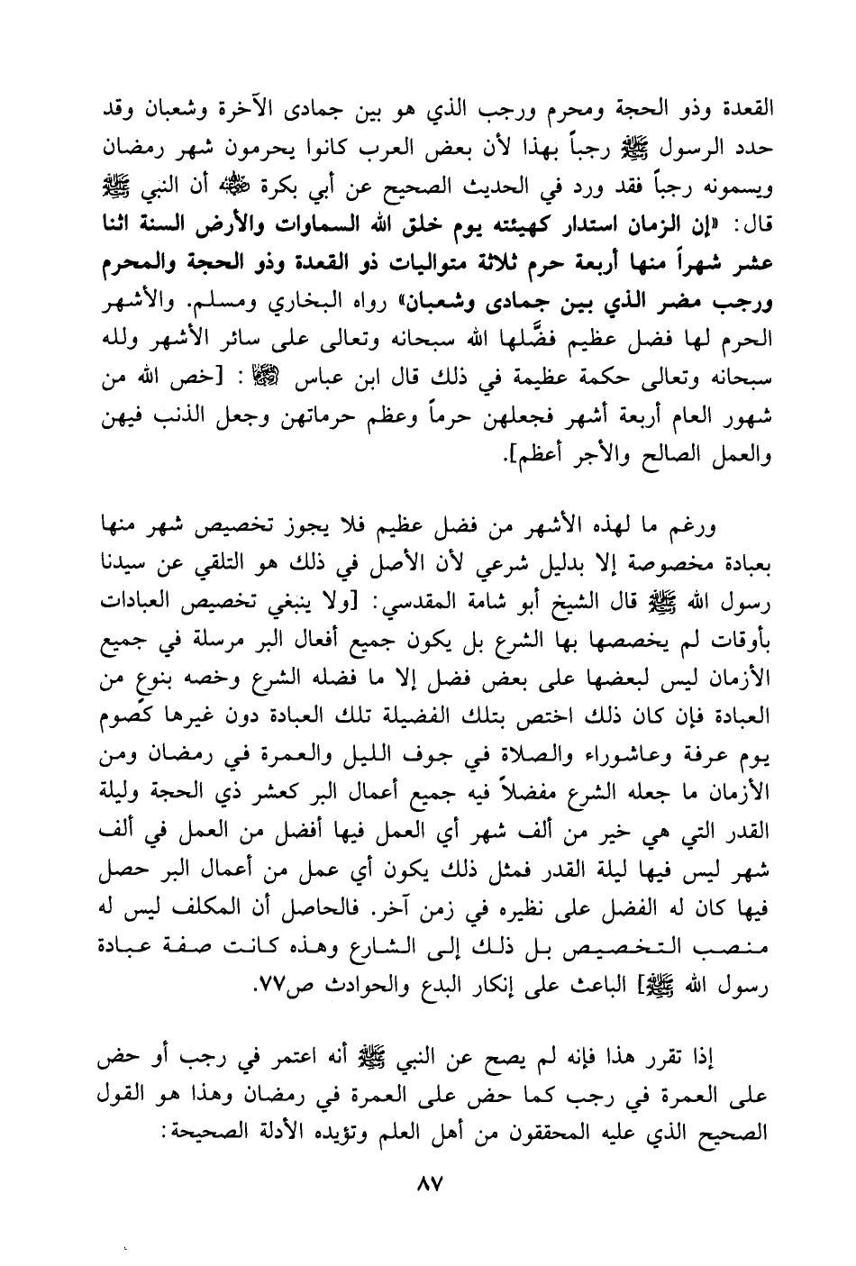 إذا تقرر هذا فإنه لم يصح عن النبي - صَلَّى اللهُ عَلَيْهِ وَسَلَّمَ - أنه اعتمر في رجب أو حض على العمرة في رجب كما حض على العمرة في رمضان وهذا هو القول الصحيح الذي عليه المحققون من أهل العلم وتؤيده الأدلة الصحيحة: