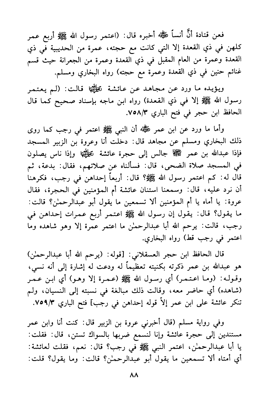 أبو عبد الرحمن؟ قالت: ما يقول؟ قال: يقول إن رسول الله - صَلَّى اللهُ عَلَيْهِ وَسَلَّمَ - اعتمر أربع عمرات إحداهن في رجب، قالت: يرحم الله أبا عبد الرحمن ما اعتمر عمرة إلا وهو شاهده وما اعتمر في رجب قط) رواه البخاري.