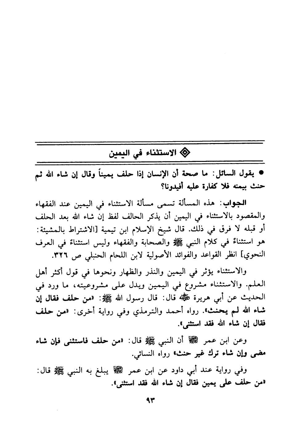 الجواب: هذه المسألة تسمى مسألة الاستثناء في اليمين عند الفقهاء والمقصود بالاستثناء في اليمين أن يذكر الحالف لفظ إن شاء الله بعد الحلف أو قبله لا فرق في ذلك. قال شيخ الإسلام ابن تيمية [الاشتراط بالمشيئة: هو استثناءٌ في كلام النبي - صَلَّى اللهُ عَلَيْهِ وَسَلَّمَ - والصحابة والفقهاء وليس استثناءً في العرف النحوي] انظر القواعد والفوائد الأصولية لابن اللحام الحنبلي ص 326.