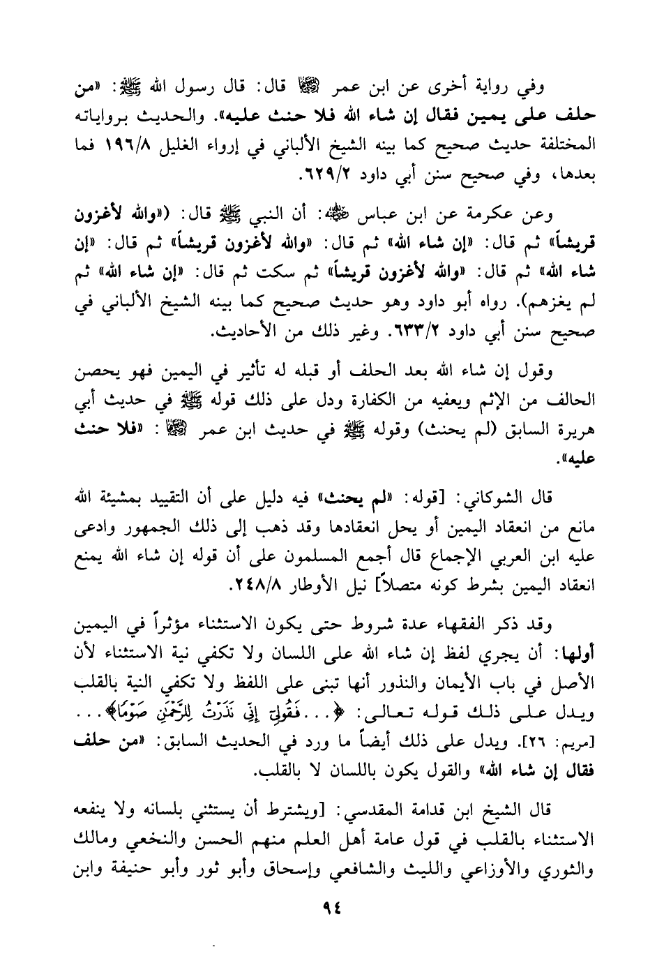 وفي رواية أخرى عن ابن عمر رضي الله عنهما قال: قال رسول الله - صَلَّى اللهُ عَلَيْهِ وَسَلَّمَ -: (من حلف على يمين فقال إن شاء الله فلا حنث عليه). والحديث برواياته المختلفة حديث صحيح كما بينه الشيخ الألباني في إرواء الغليل 8/ 196 فما بعدها، وفي صحيح سنن أبي داود 2/ 629.