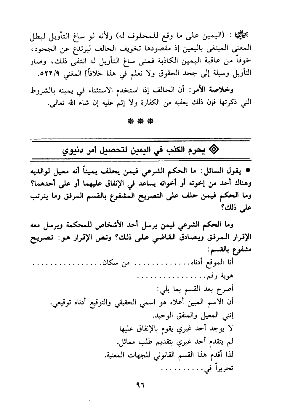 رضي الله عنها: (اليمين على ما وقع للمحلوف له) ولأنه لو ساغ التأويل لبطل المعنى المبتغى باليمين إذ مقصودها تخويف الحالف ليرتدع عن الجحود , خوفاً من عاقبة اليمين الكاذبة فمتى ساغ التأويل له انتفى ذلك , وصار التأويل وسيلة إلى جحد الحقوق ولا نعلم في هذا خلافاً] المغني 9/ 522.