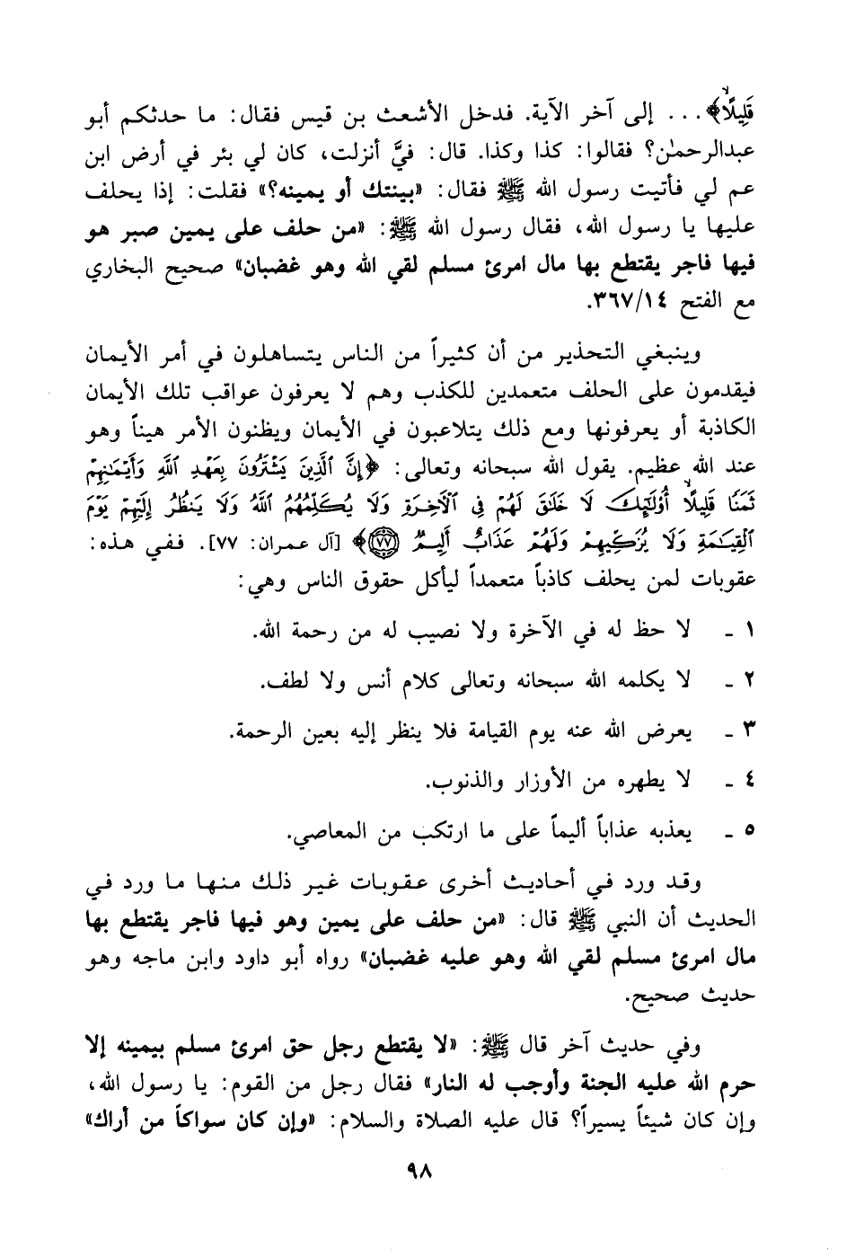قَلِيلًا ... } إلى آخر الآية. فدخل الأشعث بن قيس فقال: ما حدثكم أبو عبد الرحمن؟ فقالوا: كذا وكذا. قال: فيَّ أنزلت، كان لي بئر في أرض ابن عم لي فأتيت رسول الله - صَلَّى اللهُ عَلَيْهِ وَسَلَّمَ - فقال: (بينتك أو يمينه فقلت: إذا يحلف عليها يا رسول الله فقال رسول الله - صَلَّى اللهُ عَلَيْهِ وَسَلَّمَ - من حلف على يمين صبر هو فيها فاجر يقتطع بها مال امرئ مسلم لقي الله وهو غضبان) صحيح البخاري مع الفتح 14/ 367.