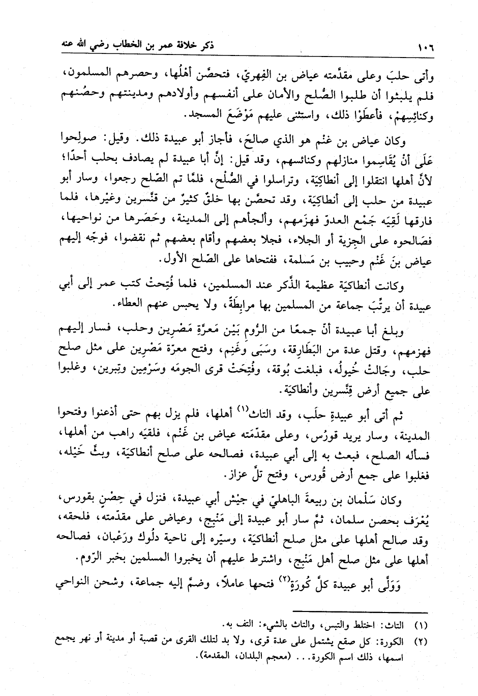 ثم أتى أبو عبيدة حلب ، وقد التاث أهلها ، فلم يزل بهم حتى أذعنوا وفتحوا المدينة ، وسار يريد قورس ، وعلى مقدمته عياض بن غنم ، فلقيه راهب من أهلها ، فسأله الصلح ، فبعث به إلى أبي عبيدة ، فصالحه على صلح أنطاكية ، وبث خيله ، فغلبوا على جمع أرض قورس ، وفتح تل عزاز .