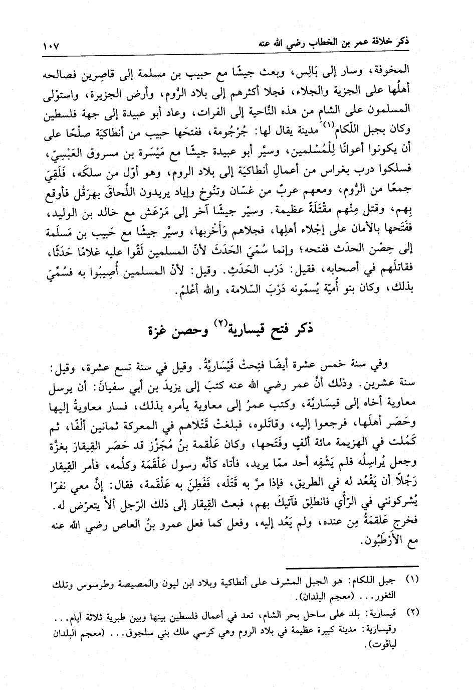 وقيل في سنة تسع عشرة ، وقيل : سنة عشرين ، وذلك أن عمر رضي الله عنه كتب إلى يزيد بن أبي سفيان : أن يرسل معاوية أخاه إلى قيسارية ، وكتب عمر إلى معاوية يأمره بذلك ، فسار معاوية إليها وحصر أهلها ، فرجعوا إليه ، وقاتلوه ، فبلغت قتلاهم في المعركة ثمانين ألفاً ، ثم كملت في الهزيمة مائة ألف وفتحها ، وكان علقمة بن مجزز قد حصر القيقار بغزة وجعل يراسله فلم يشفه أحد مما يريد ، فاتاه كأنه رسول علقمة وكلمه ، فأمر القيقار رجلاً أن يقعد له في الطريق ، فإذا مر به قتله ، ففطن به علقمة ، فقال : إن معي نفراُ يشركونني في الرأي فانطلق فآتيك بهم ، فبعث القيقار إلى ذلك الرجل ألا يتعرض له .