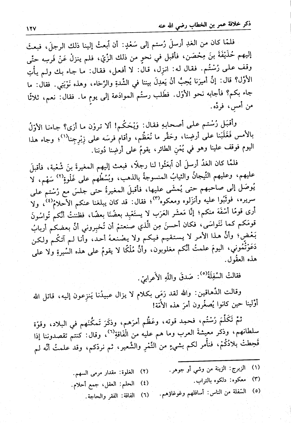 قال الدهاقين : والله لقد رمى بكلام لا يزال عبيدنا ينزعون إليه ، قاتل الله أولينا حين كانوا يصغرون أمره هذه الأمة ثم تكلم رستم ، فحمد قوته ، وعظم أمرهم ، وذكر تمكنهم في البلاد ، وقوة سلطانهم ، وذكر معيشة العرب وما هو عليه من الفاقة ، وقال : كنتم تقصدوننا إذا قحطت بلادكم ، فنأمر لكم بشيء من التمر والشعير ، ثم نردكم ، وقد علمت أنه لم