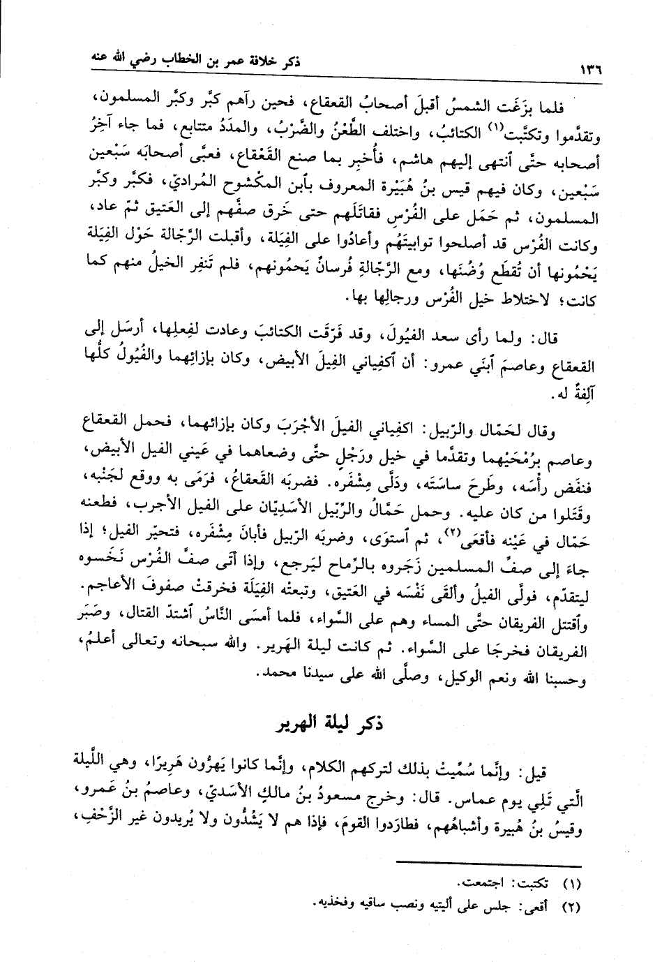 فضربه القعقاع ، فرمى به ووقع لجنبه ، وقتلوا من كان عليه ، وحمل حمال والربيل الأسديان على الفيل الأجرب ، فطعنه حمال في عينه فاقعى ، ثم استوى ، وضربه الربيل فأبان مشفرة ، فتحير الفيل ؛ إذا جاء إلى صف المسلمين زجروه بالرماح ليرجع ، وإذا أتى صف الفرس نخسوه ليتقدم ، فولى الفيل وألقى نفسه في العتيق ، وتبعته الفيلة فخرقت صفوف الأعاجم . واقتتل الفريقان حتى المساء وهم على السواء ، فلما أمسى الناس اشتد القتال ، وصبر الفريقان فخرجا على السواء ، ثم كانت ليلة الهرير . والله سبحانه وتعالى أعلم ، وحسبنا الله ونعم الوكيل ، وصلى الله على سيدنا محمد .