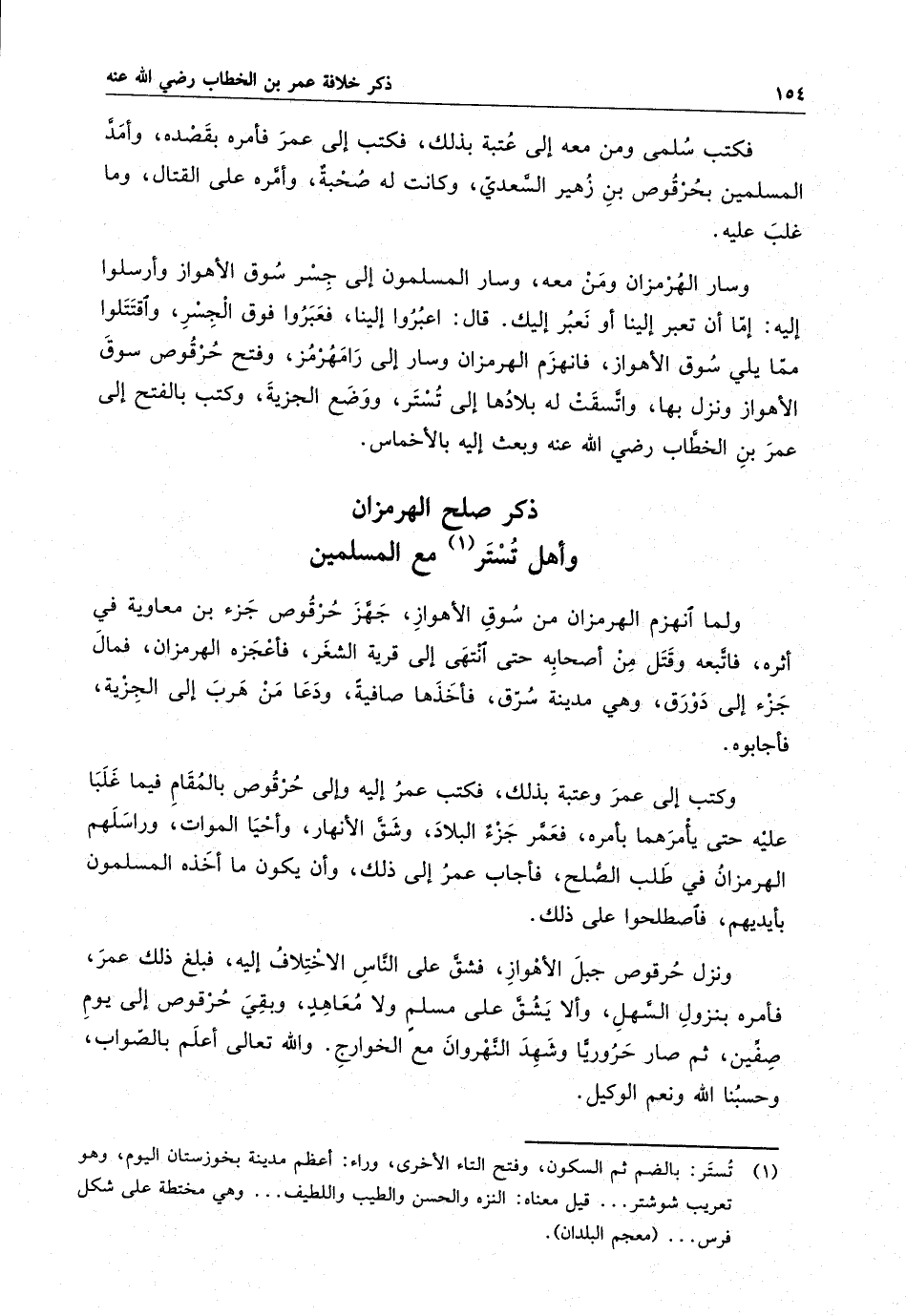 وكتب إلى عمر وعتبه بذلك ، فكتب عمر إليه وإلى حرقوص بالمقام فيما غلبا عليه حتى يأمرهما بأمره ، فعمر جزء البلاد ، وشق الأنهار ، وأحيا الأموات ، وراسلهم الهرمزان في طلب الصلح ، فأجاب عمر إلى ذلك ، وأن يكون ما أخذه المسلمون بأيديهم ، فاصطلحوا على ذلك . ونزل حرقوص جبل الأهواز ، فشق على الناس الاختلاف إليه ، فبلغ ذلك عمر ، فأمره بنزول السهل ، وألا يشق على مسلم ولا معاهد ، وبقي حرقوص إلى يوم صفين ، ثم صار حرورياً وشهد النهروان مع الخوارج . والله تعالى أعلم بالصواب ، وحسبنا الله ونعم الوكيل .