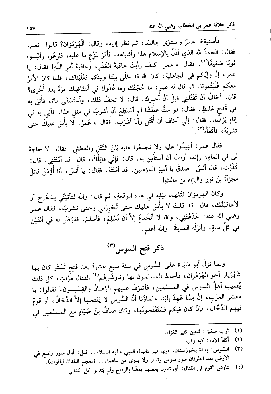 فاستيقظ عمر واستوى جالساً ، ثم نظر إليه ، وقال : الهرمزان ؟ قالوا : نعم ، فقال : الحمد لله الذي أذل بالإسلام هذا واشباهه ، فأمر بنزع ما عليه ، فنزعوه وألبسوه ثوباً صفيقاً . فقال له عمر : كيف رأيت عاقبة الغدر ، وعاقبة أمر الله فقال : يا عمر ، إنا وإياكم في الجاهلية ، كان الله قد خلى بيننا وبينكم فغلبناكم ، فلما كان الأمر معكم غلبتمونا . ثم قال له عمر : ما حجتك وما عذرك في انتفاضك مرة بعد أخرى ؟ قال : أخاف أن تقتلني قبل أن أخبرك . قال : لا تخف ذلك ، واستسقى ماءً ، فأتى به في قدح غليظ . فقال : لو مت عطشاً لم أستطع أن أشرب في مثل هذا ، فأتى به في إناء يرضاه . فقال : إنى أخاف أن أقتل وأنا أشرب . فقال له عمر : لا بأس عليك حتى تشربه ، فأكفاه ؛ فقال عمر : أعيدوا عليه ولا تجمعوا عليه بين القتل والعطش . فقال : لا حاجة لي في الماء ؛ وإنما أردت أن أستأمن به . قال : فإنى قاتلك ، قال : قد أمنتني . قال : كذبت ، قال أنس : صدق يا أمير المؤمنين ، قد أمنته . فقال : يا أنسك أنا أؤمن قاتل مجزأه أبن ثور والبراء بن مالك وكان الهرمزان قتلهما بيده في هذه الوقعة ، ثم قال ، والله لتأتيني بمخرج أو لأعاقبنك ، قال : قد قلت لا بأس عليك حتى تخبرني وحتى تشرب ، فقال عمر رضي الله عنه : خدعتني ، والله لا أنخدع إلا أن تسلم ، فأسلم ، ففرض له ألفين في كل سنة ، وأنزله المدينة والله أعلم .