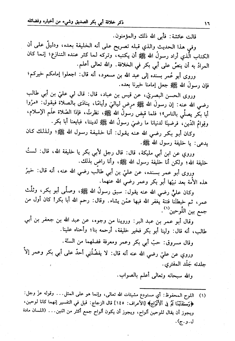 وروى أبو عمر بسنده ، عن عليّ بن أبي طالب رضى الله عنه ، أنه قال : خير هذه الأمة بعد نبيّها أبو بكر وعمر رضى الله عنهما وكان علي رضي الله عنه يقول سبق رسول الله صلى الله عليه وسلّم ، وصلّى أبو بكر ، وثلّث عمر ، ثم خبطتنا فتنة يغفر الله فيها عمّن يشاء . وقال : رحم الله أبا بكر كان أول من جمع بين اللوحين .
