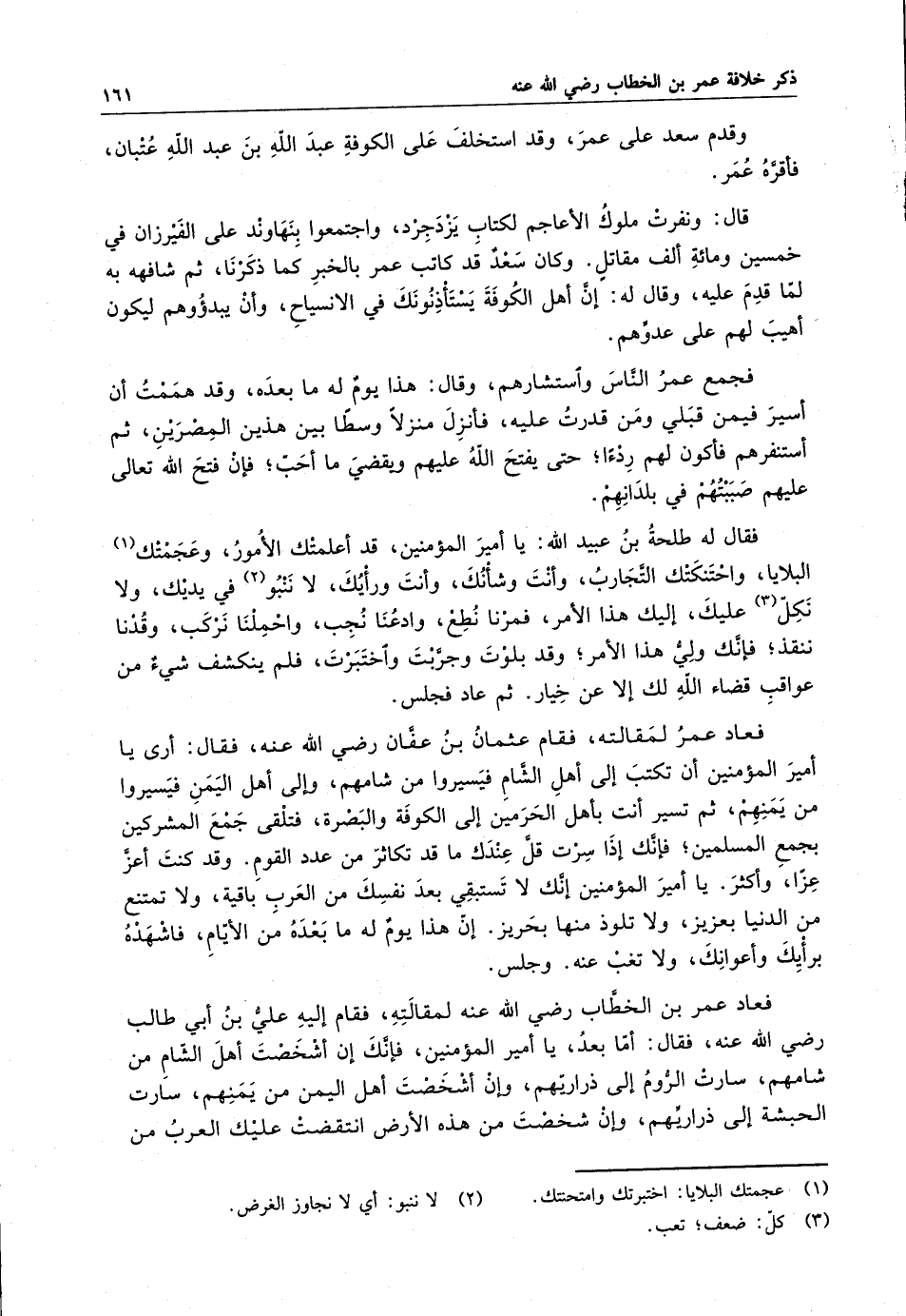 فعاد عمر لمقالته ، فقام عثمان بن عفان رضي الله عنه ، فقال ارى أمير المؤمنين أن تكتب إلى أهل الشام فيسيروا من شامهم ، وإلى أهل اليمن فيسيروا من يمنهم ، ثم تسير أنت بأهل الحرمين إلى الكوفة والبصرة ، فتلقى جمع المشركين بجمع المسلمين ؛ فإنك إذا سرت قل عندك ما قد تكاثر من عدد القوم . وقد كنت أعز عزا ، وأكثر . ياأمير المؤمنين إنك لا تستبقي بعد نفسك من العرب باقية ولا تمتنع من الدنيا بعزيز ، ولا تلوذ منها بحريز . إن هذا يوم له مابعده من الأيام ، فأشهده برأيك وأعوانك ، ولا تغب عنه . وجلس .
