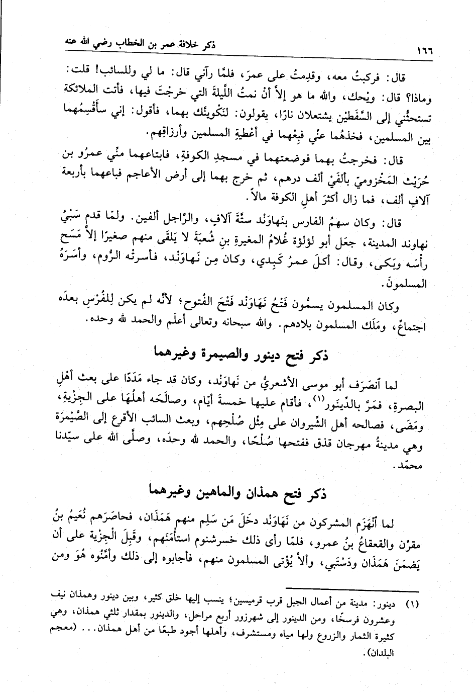 : لما انصرف أبو موسى الأشعري من نهاوند ، وكان قد جاء مددا على بعث أهل البصرة ، فمر بالدينور ، فأقام عليهما خمسة أيام ، وصالحه أهلها على الجزية ، ومضى ، فصالحه أهل الشيروان على مثل صلحهم ، وبعث السائب الأقرع إلى الصيمرة وهي مدينة مهرجان قذق ففتحها صلحاً ، والحمد لله وحده ، وصلى الله علي سيدنا محمد .