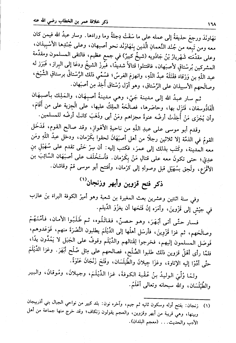 فسار حتى أتى أبهر ، وهو حصن ، فقاتلوه ، ثم طلبوا الأمان ، فأمنهم وصالحهم ، ثم غزا قزوين ، فأرسل أهلها إلى الديلم يطلبون النصرة منهم ، فوعدهوهم ، فوصل المسلمون إليهم ، فخرجوا لقتالهم الديلم وقوف على الجبل لا يمدون يداً ، فلما رأى أهل قزوين ذلك طلبوا الصلح ، فصالحهم على مثل صلح أبهر . وغزا الديلم حتى أدوا إليه الأتاوة ، وغزا جيلان والطيلسان ، وفتح زنجان عنوة .