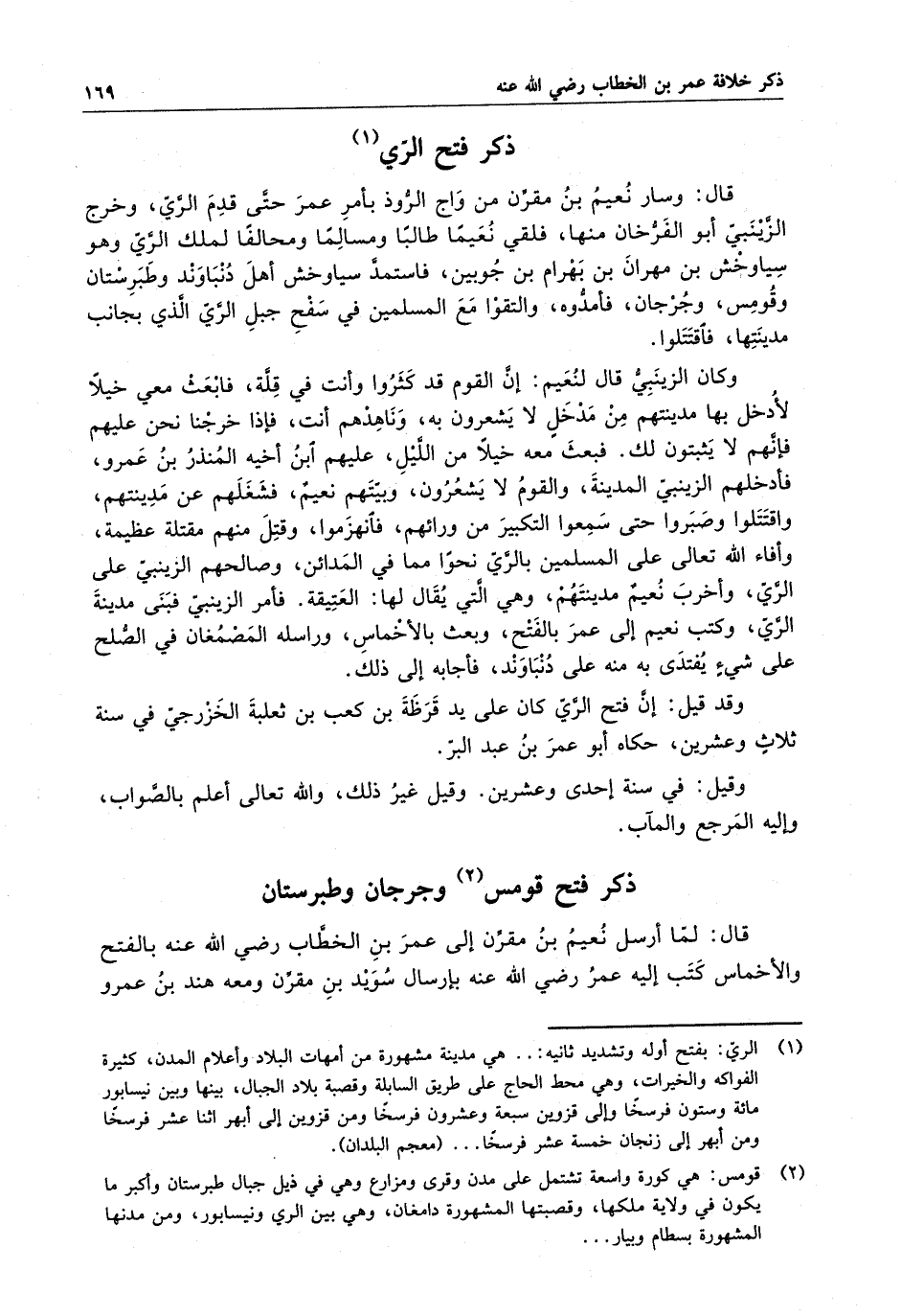 قال : وسار نعيم بن مقرن من واج الروذ بأمر عمر حتى قدم الري ، وخرج الزيني أبو الفرخان منها ، فلقى نعيماً طالباً ومسالماً ومحالفاً لملك الري وهو سياوخش بن مهران بن بهرام بن جوبين ، فاستمد سياوخش أهل دنباوند وطبرستان وقومس ، وجرجان ، فأمدوه ، والتقوا مع المسلمين في سفح جبل الري الذي بجانب مدينتها ، فاقتتلوا . وكان الزينبي قال لنعيم : إن القوم قد كثروا وأن في قلة ، فأبعث معي خيلاً لأدخل بها مدينتهم من مدخل لا يشعرون به ، وناهدهم أنت ، فإذا خرجنا نحن عليهم فإنهم لا يثبتون لك . فبعث معه خيلاً من الليل ، عليهم ابن أخيه المنذر بن عمرو ، فأدخلهم الزيني المدينة ، والقوم لا يشعرون ، وبيتهم نعيم ، فشغلهم عن مدينتهم ، واقتتلوا وصبروا حتى سمعوا التكبير من روائهم ، فانهزموا ، وقتل منهم مقتلة عظيمة ، وأفاء الله تعالى على المسلمين بالري نحو مما في المدائن ، وصالحهم الزيني على الري ، وأخرب نعيم مدينتهم ، وهي التي يقال لها : العتيقة . فأمر الزيني فبنى مدينة الري ، وكتب نعيم إلى عمر بالفتح ، وبعث بالأخماس ، وراسله المصمغان في الصلح على شيء يفتدي به منه على دنباوند ، فأجابه على ذلك .