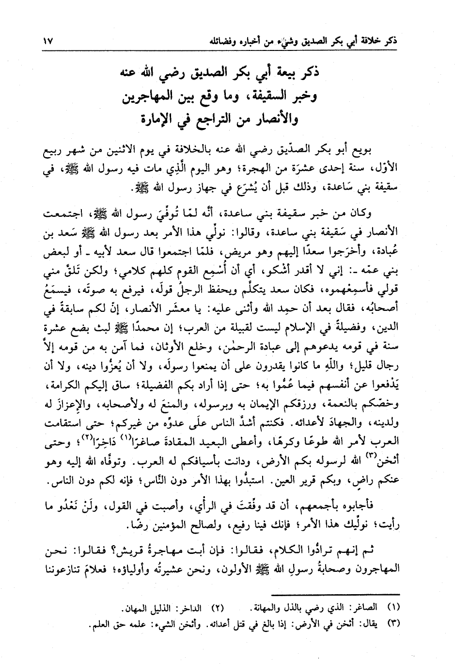 ذكر بيعة أبى بكر الصديق رضى الله عنه وخبر السقفية ، وما وقع بين المهاجرين والأنصار من التراجع في الإمارة