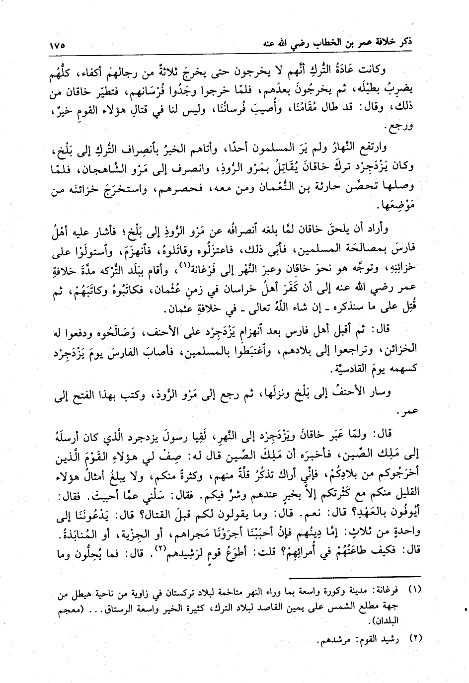 قال : ولما عبر خاقان ويزدجرد إلى النهر ، لقيا رسول يزدجرد الذي كان ارسله إلى ملك الصين قال له : صف لي هؤلاء القوم الذين أخرجوكم من بلادكم ، فإنى أراك تذكر قلة منهم ، وكثرة منكم ، ولا يبلغ امثال هؤلاء القليل منكم مع كثرتكم إلا بخير عندهم وشر فيكم . فقال : سلني عما أحببت . فقال : أيوفون العهد ؟ قال : نعم . قال : ومايقولون لكم قبل القتال ؟ اقال : يدعوننا إلى واحدة من ثلاث : إما دينهم فإن أحببنا أجرونا مجراهم ، أو الجزية ، أو المنابذة . قال : فكيف طاعتهم في أمرائه ؟ قلت : أطوع قوم لرشيدهم . قال : فما يحلون وما