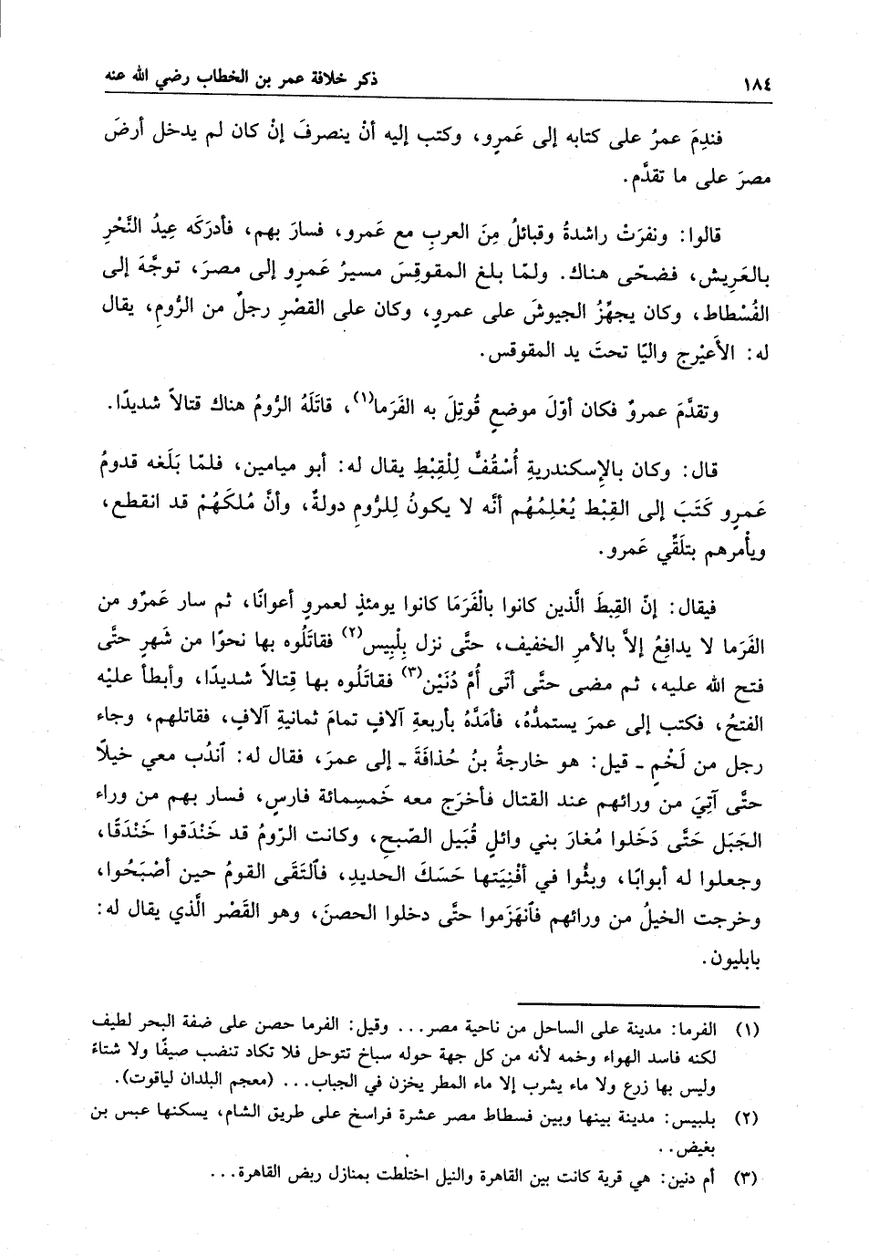 وتقدم عمر فكان أول موضع قوتل به الفرما ، قاتله الروم هناك قتالاً شديداُ .