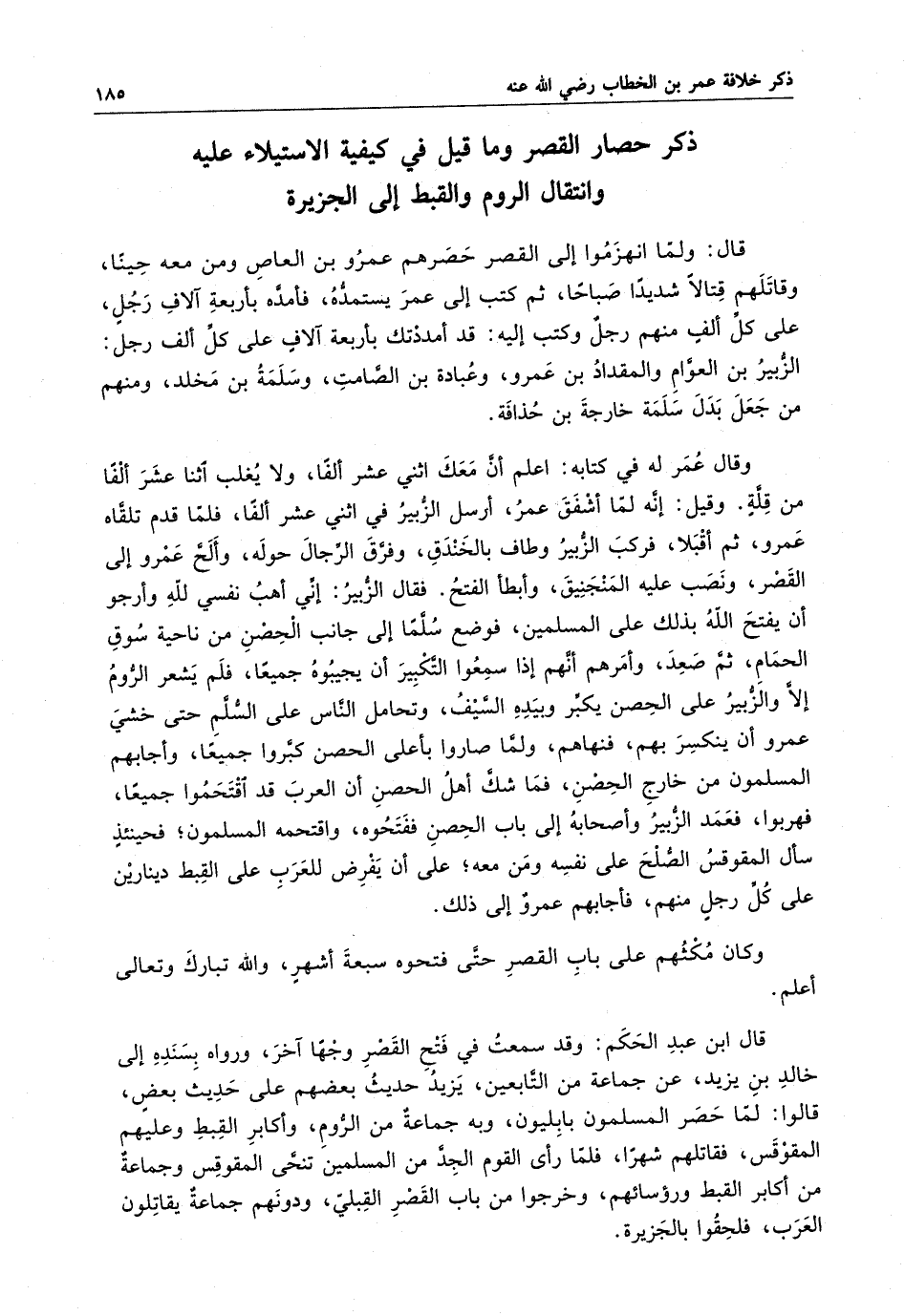 قال : ولما انهزموا إلى القصر حصرهم عمرو بن العاص ومن معه حيناً ، وقاتلهم قتالاً شديداً صباحا ، ثم كتب إلى عمر يستمده ، فأمده بأربعة آلاف رجل ، على كل الف منهم رجل وكتب إليه قد أمددتك بأربعة آلاف على كلف ألف رجل : الزبير بن العوام والمقداد بن عمرو ، وعبادة بن الصامت ، وسلمه بن مخلد ، ومنهم من جعل بدل سلمة خارجة بن حذافة . وقال عمر له في كتابه : أعلم أن معك اثني عشر الفاً ، ولا يغلب اثنا عشر ألفا من قلة . وقيل : إنه لما أشفق عمر ، أرسل الزبير في اثني عشر ألفاً ، فلما قدم تلقاه عمرو ، ثم أقبلا ، فركب الزبير وطاف بالخندق ، وفرق الرجال حوله ، وألح عمرو إلى القصر ، ونصب عليه المنجنيق ، وأبطأ الفتح . فقال الزبير : إني أهب نفسي لله وأرجو أن يفتح الله بذلك على المسلمين ، فوضع سلما إلى جانب الحصن من ناحية سوق الحمام ، ثم صعد ، وأمرهم أنهم إذا سمعوا التكبير أن يجيبوه جميعاً ، فلم يشعر الروم إلا والزبير على الحصن يكبر وبيده السيف ، وتحامل الناس على السلم حتى خشي عمرو أن ينكسر بهم ، فنهاهم ، ولما صاروا بأعلى الحصن كبروا جميعاً ، وأجابهم المسلمون من خارج الحصن ، فما شك أهل الحصن أن العرب قد اقتحموا جميعاً ، فهربوا ، فعمد الزبير وأصحابه إلى باب الحصن ففتحوه ، واقتحمه المسلمون ؛ فحينئذ سأل المقوقس الصلح على نفسه ومن معه ؛ على أ ن يفرض للعرب على القبط دينارين على كل رجل منهم ، فأجابهم عمرو إلى ذلك .