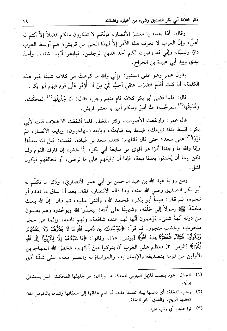 ومن رواية عبد الله بن عبد الرحمن بن أبى عمر الأنصاري ، وذكر ما تكلّم به أبو بكر الصديق رضى الله عنه ، وما قاله الأنصار ، فقال بعد أن ساق ما تقدم أو نحوه ، ثم قال : فبدأ أبو بكر ، فحمد اله ، وأثنى عليه ، ثم قال : إن الله بعث محمدا صلّى الله عليه وسلّم رسولاً إلى خلقه ، وشهيداً على أمّته ؛ ليعبدوا الله ويوحّدوه وهم يعبدون من دونه آلهةً شتى ، يزعمون أنّها لهم عنده شافعة ، ولهم نافعة ، وإنّما هي حجر منحوت ، وخشب منجور . ثم قرأ : " ويعبدون من دون الله مالا يضرّهم ولا ينفعهم ويقولون هؤلاء شفعاونا عند الله " ، وقالوا : " ما نعبدهم إلا ليقربونا إلى الله زلفى " فعظم على العرب أن يتركوا دين آبائهم ، فخصّ الله المهاجرين الأولين من قومه بتصديقه والإيمان به ، والمواساة له والصبر معه ، على شدّة أذى