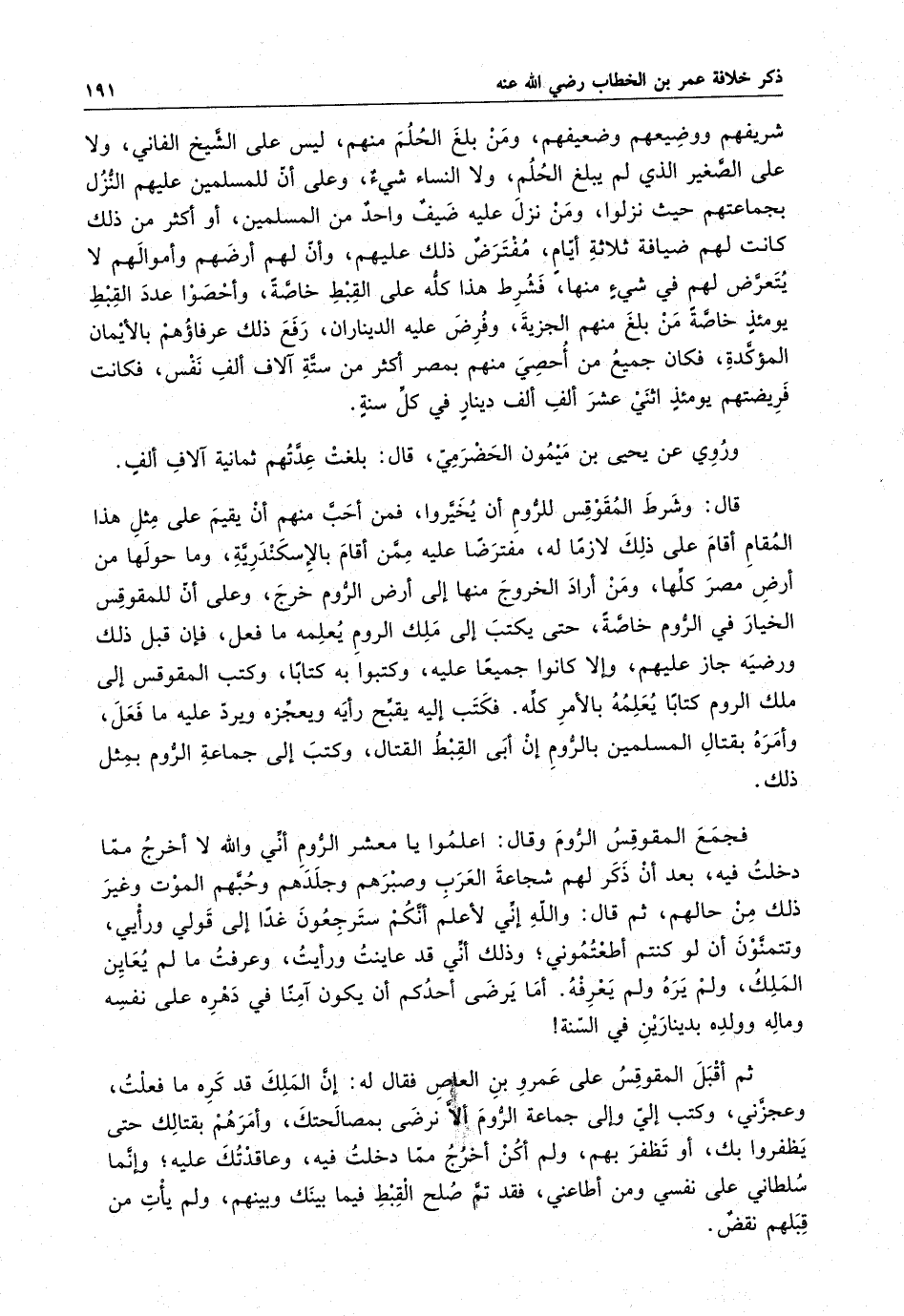 شريفهم ووضيعهم ، ومن بلغ الحلم منهم ، ليس على الشيخ الفاني ، ولا على الصغير الذي لم يبلغ الحلم ، ولا النساء شيء ، وعلى ان المسلمين عليهم النزل لجماعتهم حيث نزلوا ، ومن نزل عليه ضيف واحد من المسلمين ، أو أكثر من ذلك كانت لهم ضيافة ثلاثة أيام ، مفترض ذلك عليهم ، وأن لهم ارضهم وأموالهم لا يتعرض لهم في شيء منها ، فشرط هذا كله على القبط خاصة ، وأحصوا عدد القبط يومئذ خاصة من بلغ منهم الجزية ، وفرض عليه الديناران ، رفع ذلك عرفائهم بالإيمان المؤكدة ، فكان جميع من أحصى منهم بمصر أكثر من ستة آلاف ألف نفس ، فكانت فريضتهم يومئذ اثني عشر ألف دينار في كل سنة .