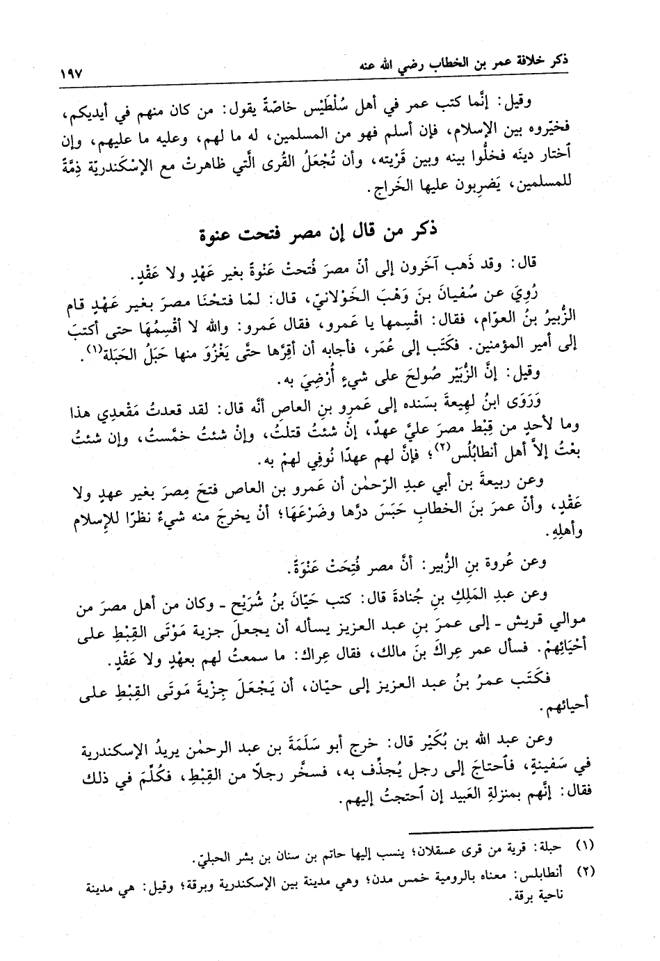 وقيل : إنما كتب عمر في أهل سلطيس خاصة يقول : من كان منهم في أيديكم ، فخيروه بين الإسلام ، فإن أسلم فهو من المسلمين ، له مالهم ، وعليه ماعليهم ، وإن اختار دينه فخلوا بينه وبين قريته ، وأن تجعل القرى التي ظاهرت مع الإسكندرية ذمة المسلمين ، يضربون عليها الخراج .