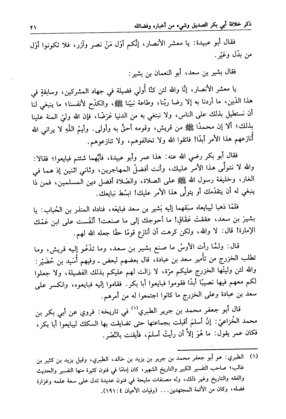 فقال بشير بن سعد ، أبو النعمان بن بشير : يا معشر الأنصار ، إنّا والله لئن كنّا أولى فضيلة في جهاد المشركين ، وسابقة في هذا الدّين ، ما أردنا به إلا رضا ربّنا ، وطاعة نبيّنا صلّى الله عليه وسلّم ، والكدح لأنفسنا ؛ ما ينبغى لنا أن نستطيل بذلك على الناس ، ولا نبتغى به من الدينا عرضا ، فإن الله ولىّ المنة علينا بذلك ؛ ألا إن محمدا صلّى الله عليه وسلّم من قريش ، وقومه أحقّ به وأولى . وايم الله لا يرانى الله أنازعهم هذا الأمر أبدا فاتقوا الله ولا تخالفوهم ، ولا تنازعوهم .