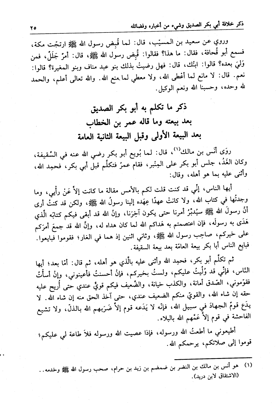 ذكر ما تكلم به أبو بكر الصديق بعد بيعته وما قاله عمر بن الخطاب بعد البيعة الأولى وقبل البيعة الثانية العامة