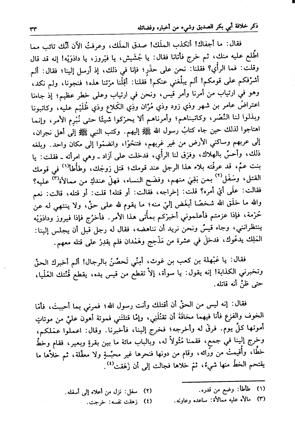فقال : ما أجفاك أتكذب الملك صدق الملّك ، وعرفت الآن أنك تائب مما أطّلع عليه منك ، ثم خرج فأتانا فقال : يا جشيش ، يا فيروز ، يا داذويه إنه قد قال وقلت : فما الرأي ؟ فقلنا : نحن على حذر ؛ فإنا في ذلك ، إذ أرسل إلنيا ؛ فقال : ألم أشرفكم على قومكم ألم يبلغني عنكم فقلنا : أقلنا مرّتنا هذه ؛ فنجونا ، ولم نكد ، وهو في ارتباب من أمرنا وأمر قيس ، ونحن في ارتياب وعلى خطر عظيم ؛ إذ جاءنا اعتراض عامر بن شهر وذي زود وذي مرّان وذي الكلاع وذي ظليم عليه ، وكاتبونا وبذلوا لنا النّصر ، وكاتبناهم ؛ وأمرناهم ألا يحركوا شيئا حتى نبرم الأمر ، وإنما اهتاجوا لذلك حين جاء كتاب رسول الله صلّى الله عليه وسلّم إليهم . وكتب التبي ( صلى الله عليه وسلم ) إلى أهل نجران ، إلى عربهم وساكني الأرض من غير عربهم ، فتنحّوا ، وانضمّوا إلى مكان واحد . وبلغه ذلك ، وأحس بالهلاك ، وفرّق لنا الرأي ، فدخلت على آزاد - وهي امرأته - فقلت : يابنت عمّ ، قد عرفت بلاء هذا الرجل عند قومك ؛ قتل زوجك ، وطأطأ في قومك القتل ، وسفل بمن بقي منهم ، وفضح النساء ، فقالت : أو قتله ، قالت : نعم والله ما خلق الله شخصّا أبغض إلىّ منه ؛ ما يقوم الله على حقّ ، ولا ينتهي له عن حرمه ، فإذا عزمتم فأعلموني أخبركم بمأتي هذا الأمر . فأخرج فإذا فيروز وداذويه ينتظراني ، وجاء قيس ونحن نريد أن نناهضه ، فقال له رجل قبل أن يجلس إلينا : الملك يدعوك ، فدخل في عشرة من مذحج وهمذان فلم يقدر على قتله معهم .