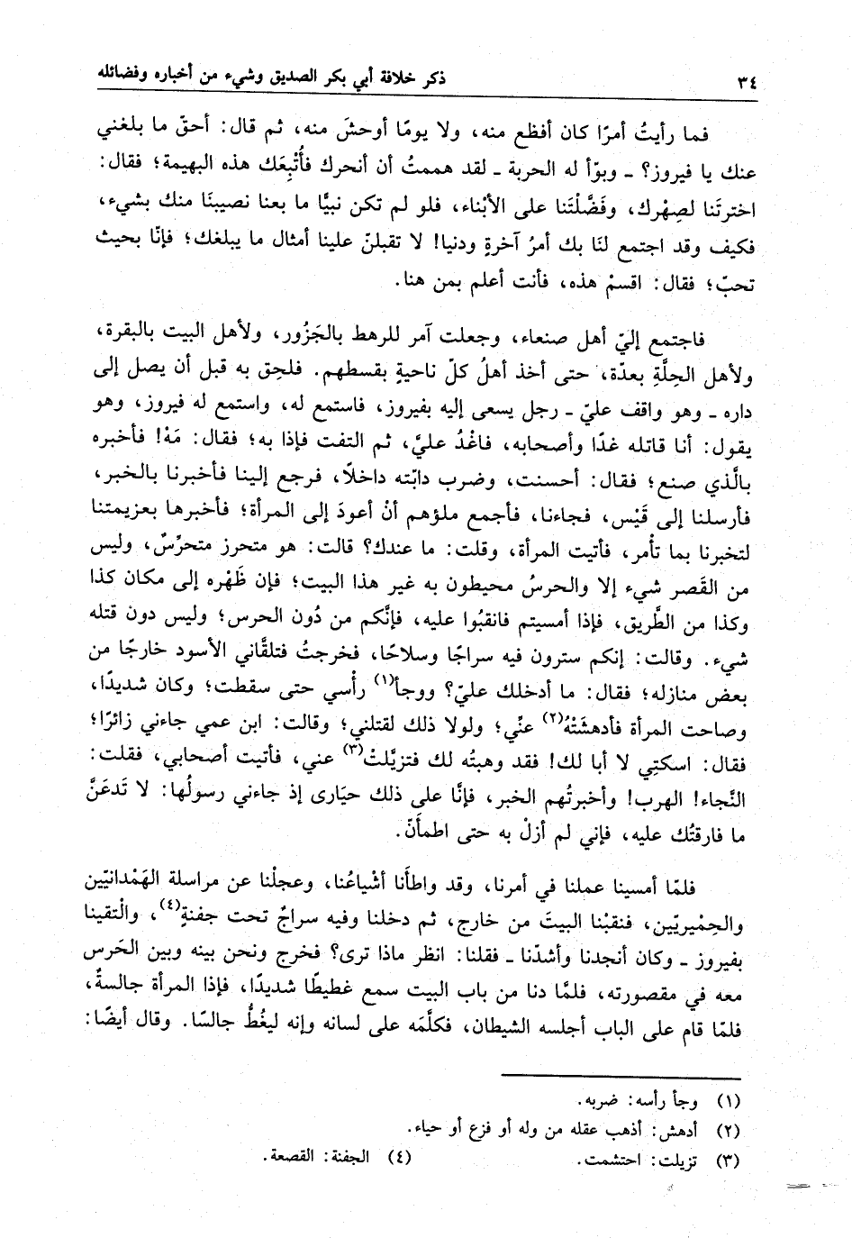 فما رأيت أمراً كان أفظع منه ، ولا يوماً أوحش منه ، ثم قال : أحق ما بلغني عنك يا فيروز ؟ - وبوّأ له الحربة - لقد هممت أن أنحرك فأتبعك هذه البهيمة ؛ فقال : اخترتنا لصهرك ، وفضّلتنا على الأنباء ، فلو لم تكن نبياً ما بعنا نصبينا منك بشيء ، فكيف وقد اجتمع لنا بك أمر آخرة ودينا لا تقبلن علينا أمثال ما يبلغك ؛ فإنا بحيث تحبّ ؛ فقال : اقسم هذه ، فأنت أعلم بمن هنا . فاجتمع إلى أهل صنعاء ، وجعلت آمر للرهط بالجزور ، ولأهل البيت بالبقرة ، ولأهل الحلّة بعدّة ، حتى أخذ أهل كلّ ناحية بقسطهم . فلحق به قبل أن يصل إلى داره - وهو واقف علىّ - رجل يسعى إليه بفيروز ، فاستمع له ، واستمع له فيروز ، وهو فيقول : أنا قاتله غداً وأصحابه ، فاغد علىّ ، ثم التفت فإذا به ؛ فقال : مه فأخبره بالّذي صنع ؛ فقال : أحسنت ، وضرب دابّته داخلاً ، فرجع إلينا فأخبرنا بالخبر ، فأرسلنا إلى قيس ، فجاءنا ، فأجمع ملؤهم أن أعود إلى المرأة ؛ فأخبرها بعزيمتنا لتخبرنا بما تأمر ، فأتيت المرأة ، وقلت : ما عندك ؟ قالت : هو متحرز متحرّس ، وليس من القصر شيء إلا والحرس محيطون به غير هذا البيت ؛ فإن ظهره إلى مكان كذا وكذا من الطريق ، فإذا أمسيتم فانقبوا عليه ، فإنكم من دون الحرس ؛ وليس دون قتله شيء . وقالت : إنكم سترون فيه سراجاً وسلاحاً ، فخرجت فتلقّاني الأسود خارجاً من بعض منازله ؛ فقال : ما أدخلك علىّ ؟ ووجأ رأسي حتى سقطت ؛ وكان شديداً ، وصاحت المرأة فأدهشته عنّي ؛ ولولا ذلك لقتلني ؛ وقالت : ابن عمي جاءني زائرا ؛ فقال : اسكتي لا أبا لك فقد وهبته لك فتزيّلت عني فأتيت أصحابي فقلت النجاة الهرب وأخبرتهم الخبر ، فإنّا على ذلك حيارى إذ جاءني رسولها : لا تدعنّ ما فارقتك عليه ، فإني لم أزل به حتى اطمأنّ . فلمّا أمسينا عملنا في أمرنا ، وقد واطأنا أشياعنا ، وعجلنا عن مراسلة الهمدانيين والحميريين ، فنقبنا البيت من خارج ، ثم دخلنا وفيه سراج تحت جفنة ، والتقينا بفيروز - وكان أنجدنا وأشدنا - فقلنا : انظر ماذا ترى ؟ فخرج ونحن بينه وبين الحّرس معه في مقصورته ، فلمّا دنا من باب البيت سمع غطيطا شديداً ، فإذا المرأة جالسة ، فلمّا قام على الباب أجلسه الشيطان ، فكلّمه على لسانه وإنه ليغطّ جالساً . وقال أيضاً :