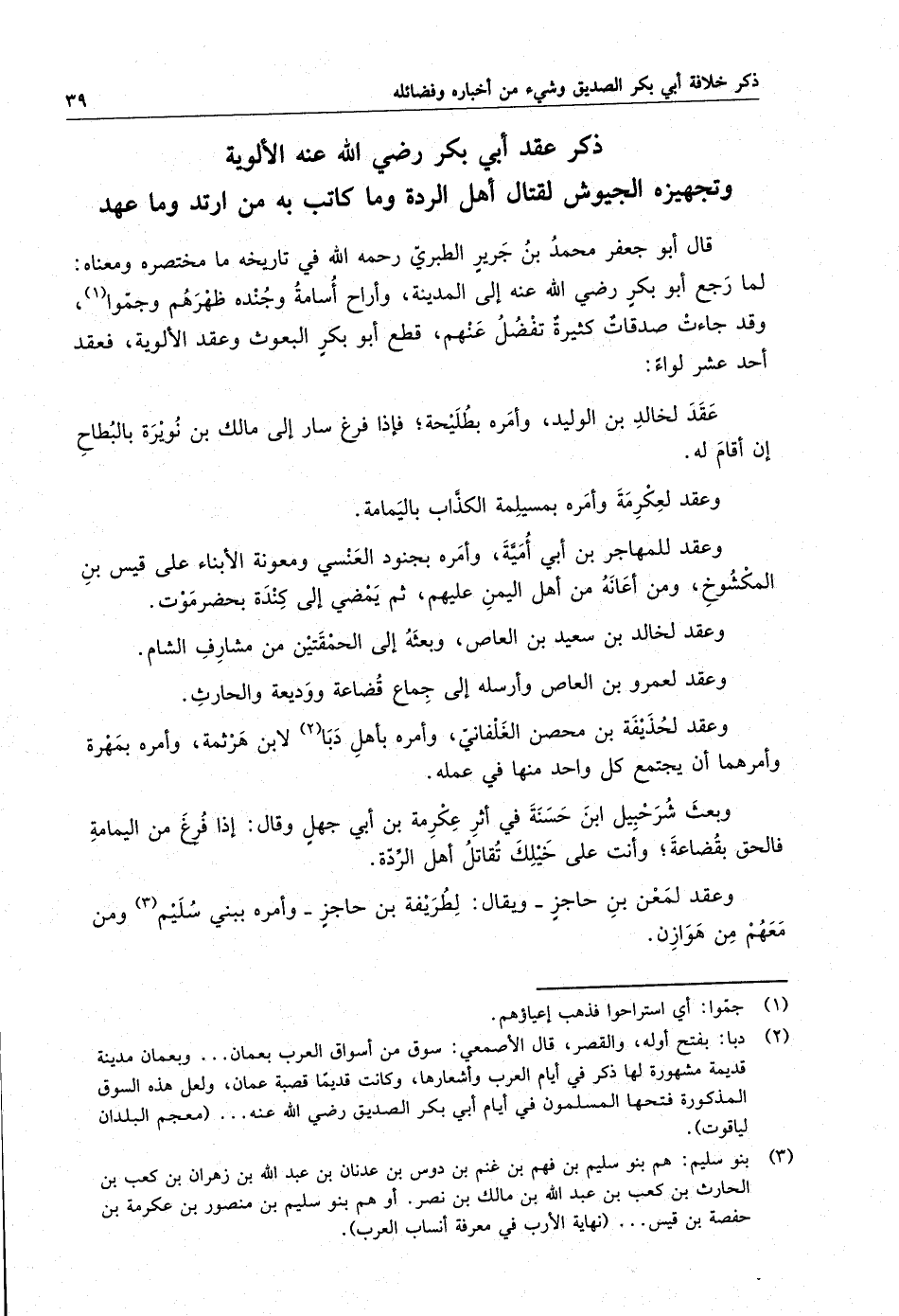 . قال أبو جعفر محمد بن جرير الطبرىّ رحمه الله في تاريخه ما مختصره ومعناه : لما رجع أبو بكر رضى الله عنه إلى المدينة ، وأراح أسامة وجنده ظهرهم وجمّوا ، وقد جاءت صدقات كثيرة تفضل عنهم ، قطع أبو بكر البعوث وعقد الألوية ، فعقد أحد عشر لواءً : عقد لخالد بن الوليد ، وأمره بطليحة ؛ فإذا فرغ سار إلى مالك ابن نويرة بالبطاح إن أقام له . وعقد لعكرمة وأمره بمسيلمة الكذّاب باليمامة . وعقد للمهاجر بن أبي أميّة ، وأمره بجنود العنسىّ ومعونة الأنباء على قيس بن المكشوخ ، ومن أعانه من أهل اليمن عليهم ، ثم يمضى إلى كندة بحضرموت .
