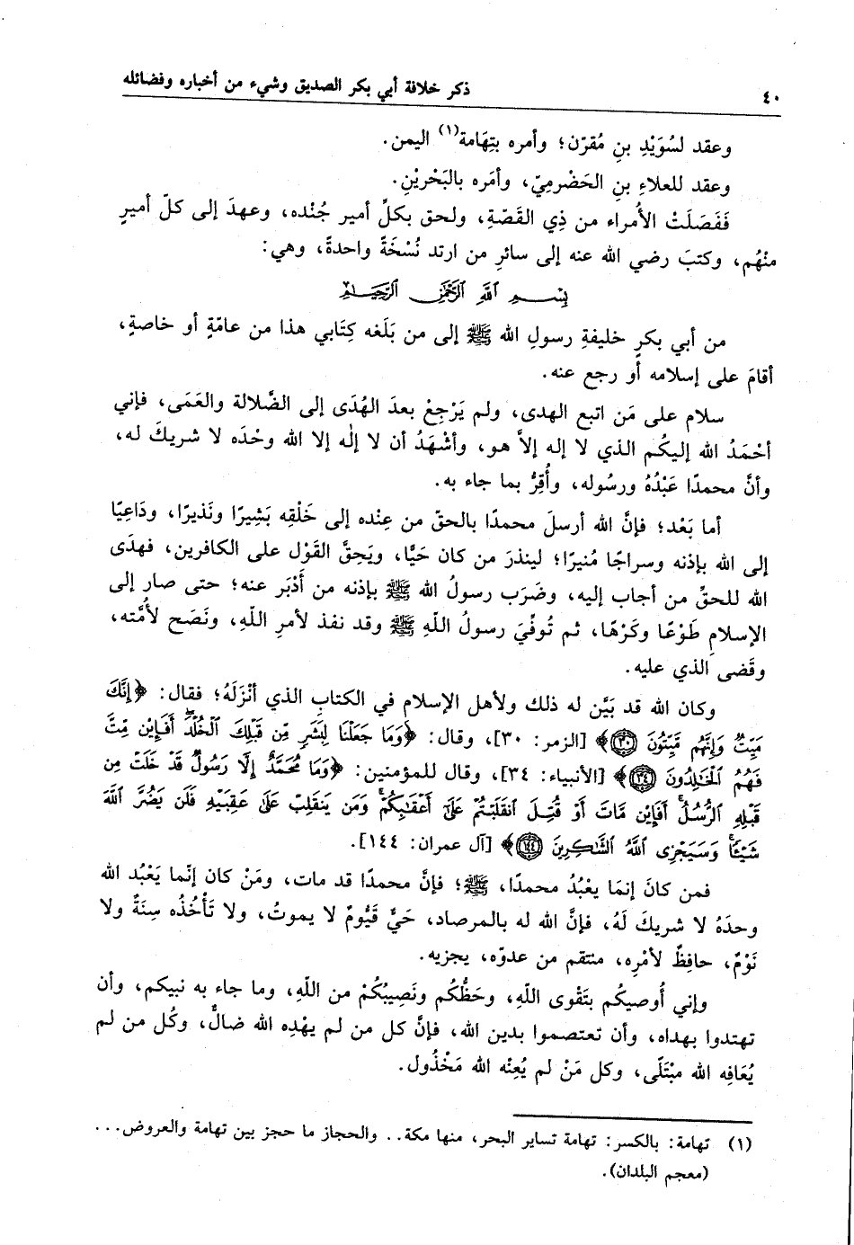 ففصلت الأمراء من ذي القصّة ، ولحق بكلّ أمير جنده ، وعهد إلى كل أمير منهم ، وكتب رضى الله عنه إلى سائر من ارتد نسخةً واحدةً ، وهي : بسم الله الرحمن الرحيم من أبي بكر خليفة رسول الله صلّى الله عليه وسلم إلى من بلغه كتابى هذا من عامّة أو خاصة ، أقام على إسلامه أو رجع عنه . سلام على من اتبع الهدى ، ولم يرجع بعد الهدى إلى الضّلالة والعمى ، فإني أحمد الله إليكم الذي لا إله إلاّ هو ، وأشهد أن لا إله إلا الله وحده لا شريك له ، وأنّ محمداً عبده ورسوله ، وأقرّ بما جاء به . أما بعد ؛ فإنّ الله أرسل محمداً بالحقّ من عنده إلى خلقه بشيراً ونذيراً ، ودّاعياً إلى الله بإذنه وسراجاً منيراً ؛ لينذر من كان حيّاً ، ويحقّ القول على الكافرين ، فهدى الله للحقّ من أجاب إليه وضرب رسول الله صلّى الله عليه وسلّم بإذنه من أدبر عنه ؛ حتى صار الإسلام طوعاً وكرهاً ، ثم توفى رسول الله صلّى الله عليه وسلّم وقد نفذ لأمر الله ، ونصح لأمّته ، وقضى الذي عليه . وكان الله قد بيّن له ذلك ولأهل الأسلام في الكتاب الذي أنزله ؛ فقال : " إنّك ميت وإنّهم ميّتون " ، وقال : " وما جعلنا لبشر من قبلك الخلد أفإن متّ فهم الخالدون " ، وقال للمؤمنين : " وما محمد إلاّ رسول قد خلت من قبله الرّسل أفإن مات أو قتل انقلبتم على أعقابكم ومن ينقلب على عقبيه فلن يضرّ الله شيئاً وسيجزى الله الشّاكرين " فمن كان إنما يعبد محمداً ، صلّى الله عليه وسلّم ؛ فإنّ محمداً قد مات ، ومن كان إنّما يعبد الله وحده لا شريك له ، فإنّ الله له بالمرصاد ، حىّ قيّوم لا يموت ، ولا تأخذه سنة ولا نوم ، حافظ لأمره ، منتقم من عدوّه ، يجزيه . وإني أوصيكم بتقوى الله ، وحظّكم ونصيبكم من الله ، وما جاء به نبيكم ، وأن تهتدوا بهداه ، وحظّكم ونصيبكم من الله ، وأنّ كل من لم يهده الله ضالّ ، وكل من لم يعافه الله مبتلى ، وكل من لم يعنه الله مخذول .