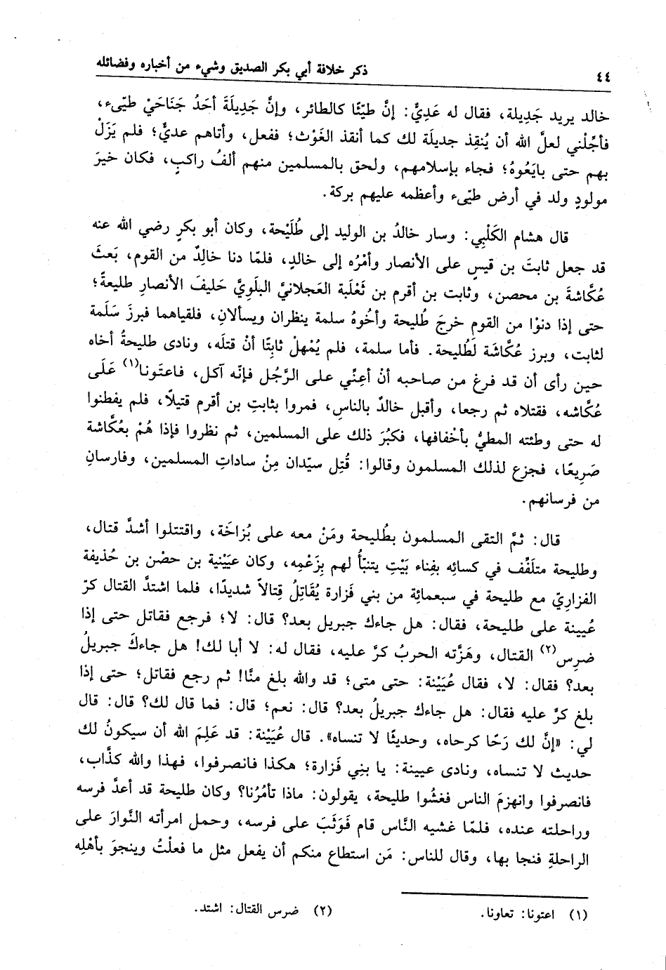 خالد يريد جديلة ، فقال له عدىّ ؛ فلم يزل بهم حتى بايعوه ؛ فجاء بإسلامهم ، ولحق بالمسلمين منهم ألف راكب ، فكان خير مولود ولد في أرض طيّىء وأعظمه عليهم بركة . قال هشام الكلبى : وسار خالد بن الوليد إلى طليحة ، وكان أبو بكر رضى الله عنه قد جعل ثابت بن قيس على الأنصار وأمره إلى خالد ، فلمّا دنا خالد من القوم ، بعث عكّاشة بن محصن ، وثابت ابن أقرم بن ثعلبة العجلانّى البلوىّ حليف الأنصار طليعةً ؛ حتى إذا والله كذّاب ، فانصرفوا وانهزم الناس فغشوا طليحة ، يقولون : ماذا تأمرنا ؟ وكان طليحة قد أعدّ فرسه وراحلته عنده ، فلمّا غشيه النّاس قام فوثب على فرسه ، وحمل امرأته النّوار على الراحلة فنجا بها ، وقال للناس : من استطاع منكم أن يفعل مثل ما فعلت وينجو بأهله