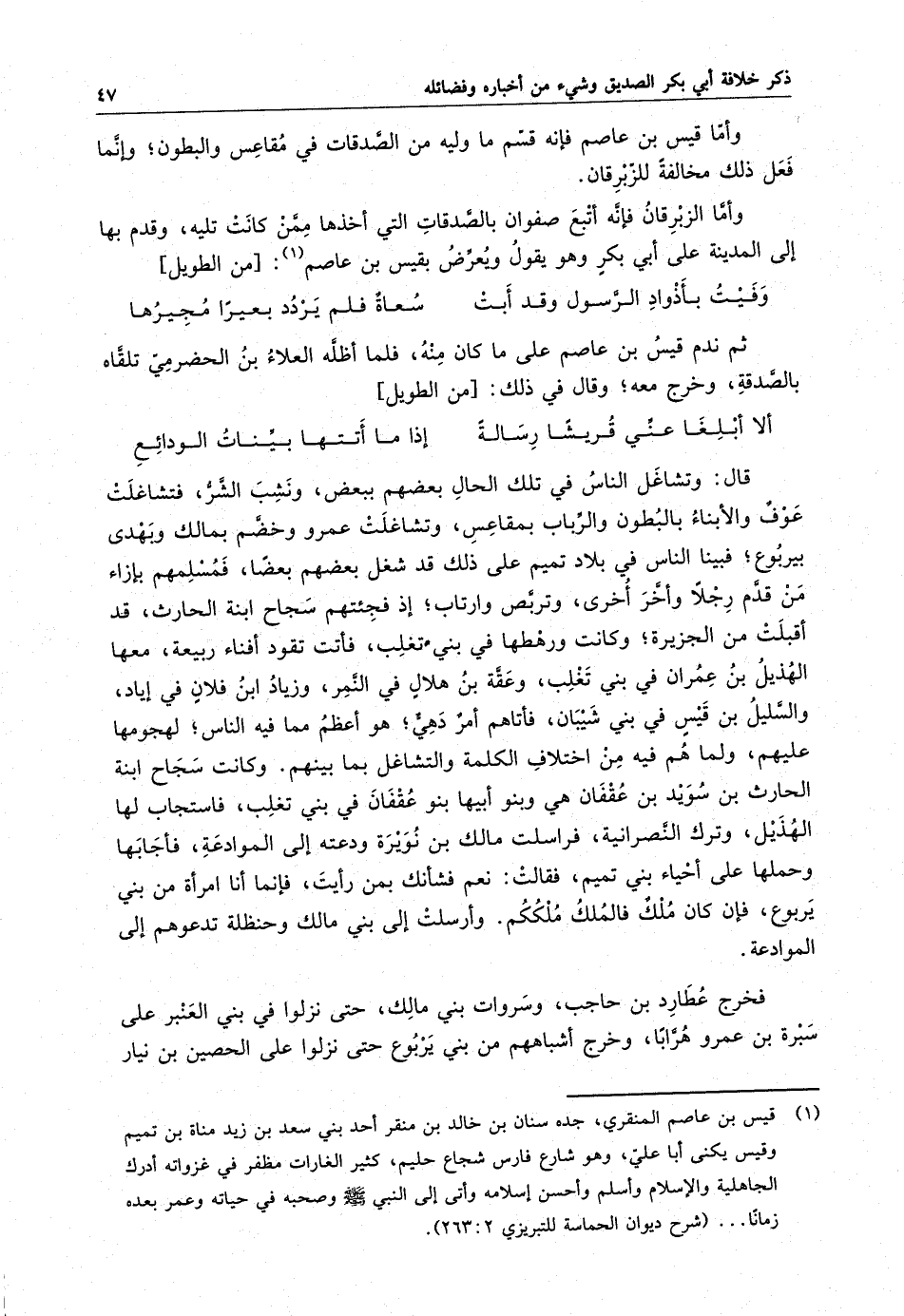 وأمّا قيس بن عاصم فإنه قسّم ما وليه من الصّدقات في مقاعس والبطون ؛ وإنّما فعل ذلك مخالفةً للزبرقان . 0 . وأمّا الزبرقان فإنّه أتبع صفوان بالصّدقات التي أخذها ممّن كانت تليه ، وقدم بها إلى المدينة على أبي بكر وهو يقول ويعرّض بقيس بن عاصم :