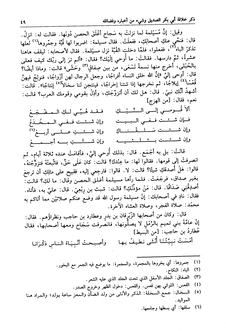 قالت : بل به أجمع . قال : بذلك أوحى إلىّ ، فأقامت عنده ثلاثة أيام ، انصرفت إلى قومها . فقالوا لها : ما عندك ؟ قالت : كان على حقّ ، فاتبعته فتزوّجته ، قالوا : هل أصدقك شيئا ؟ قالت : لا قالوا : فارجعى إليه ، فقبيح على مثلك أن ترجع بغير صداق ، فرجعت . فلما رآها مسيلمة أغلق الحصن وقال : مالك ؟ قالت : أصدقنى صداقا . قال : من مؤذّنك ؟ قالت : شبث بن ربعىّ . قال : علىّ به ، فأتاه . فقال : ناد في أصحابك : إن مسيلمة رسول الله قد وضع عنكم صلاتين مما أتاكم به محمّد : صلاة الفجر ، وصلاة العشاء الآخرة .